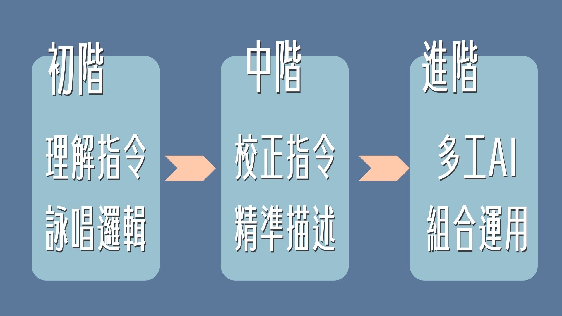 學習AI共有3階段,每一個階段都有訓練方式,到活用在自己的工作與生活中