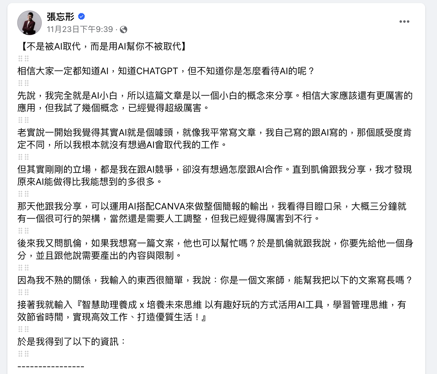 線上課程:《AI應用時代》、《高效寫作力:15分鐘輕鬆寫出千字文》