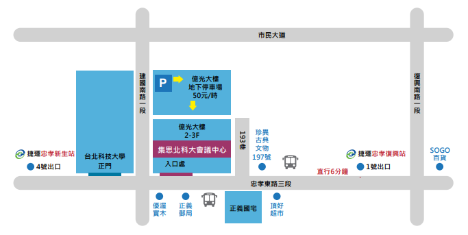 捷運請至忠孝復興站,1號出口出站後向右轉,直走6分鐘,見到Lexus大安營業所,即為臺北科技大學集思會議中心。