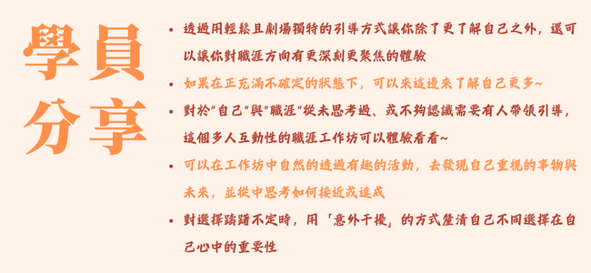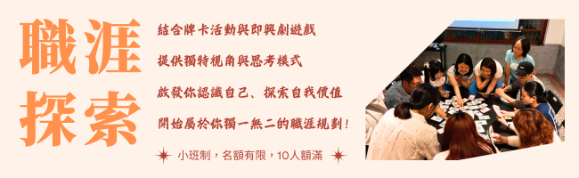 這是一場團體工作坊,透過與其他夥伴的互動,啟發也打開不同面向的自我覺察,讓你在3小時內,體驗到豐富的內容。獲得初步的體驗後,我們也提供個別諮詢服務,進一步為你量身打造符合個人需求的職涯規劃方案。