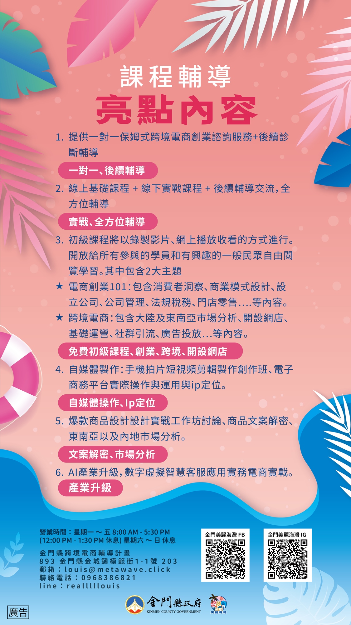課程提供一系列針對跨境電商創業者的教育和輔導服務,包括個別指導、全方位課程,以及免費初級課程,涵蓋從基本知識到自媒體運營和市場分析等多個主題,與跨境電商案例分析、成功案例及失敗案例分享,結合了線上基礎課程和線下實戰課程。為創業者提供全面的工具和策略,以取得成功並在電商領域實現產業升級。
