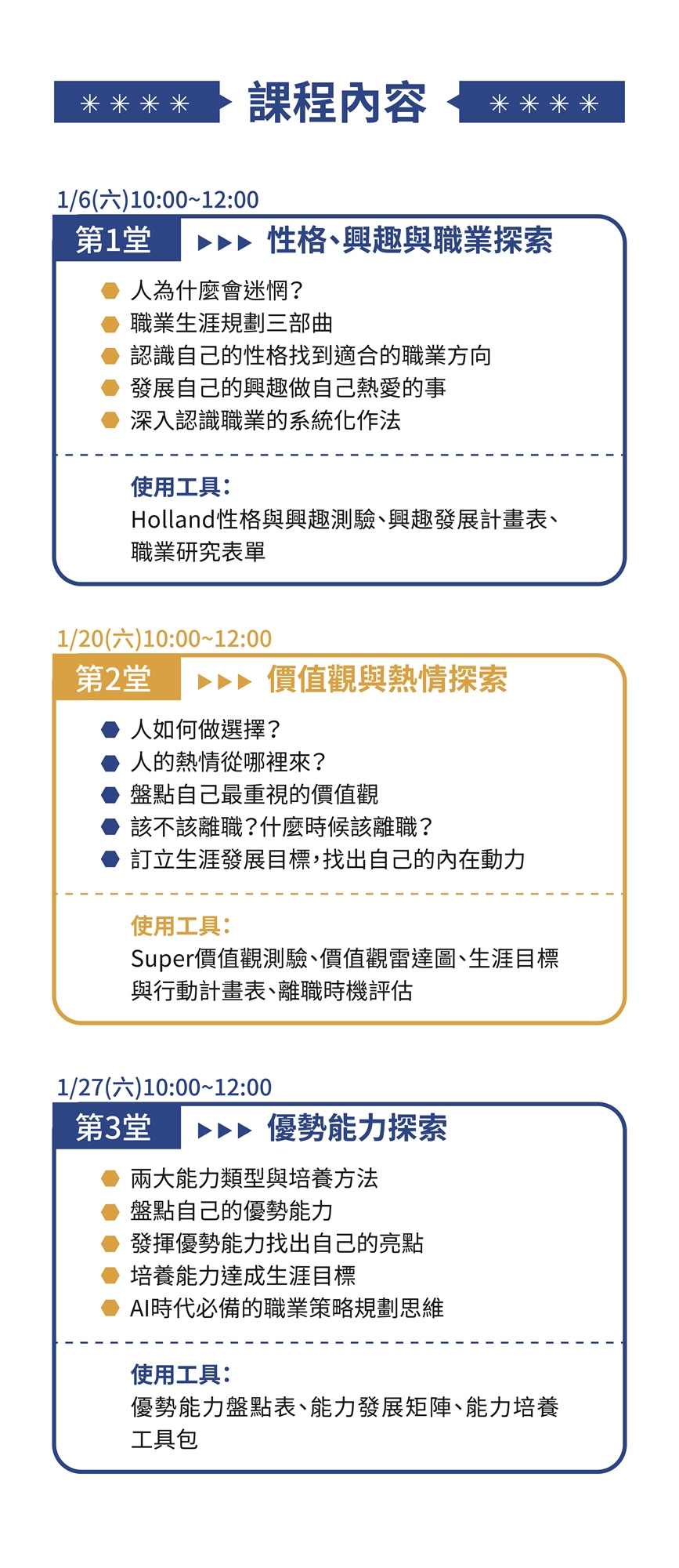 - 另有週日晚間班可選擇:https://www.accupass.com/go/careerplanning2401b