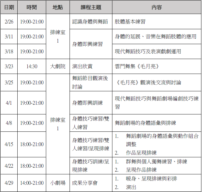 費用:6,500元(共9堂課含1場成果發表,及雲門舞集《毛月亮》演出票券1張,課程需全程參與。)