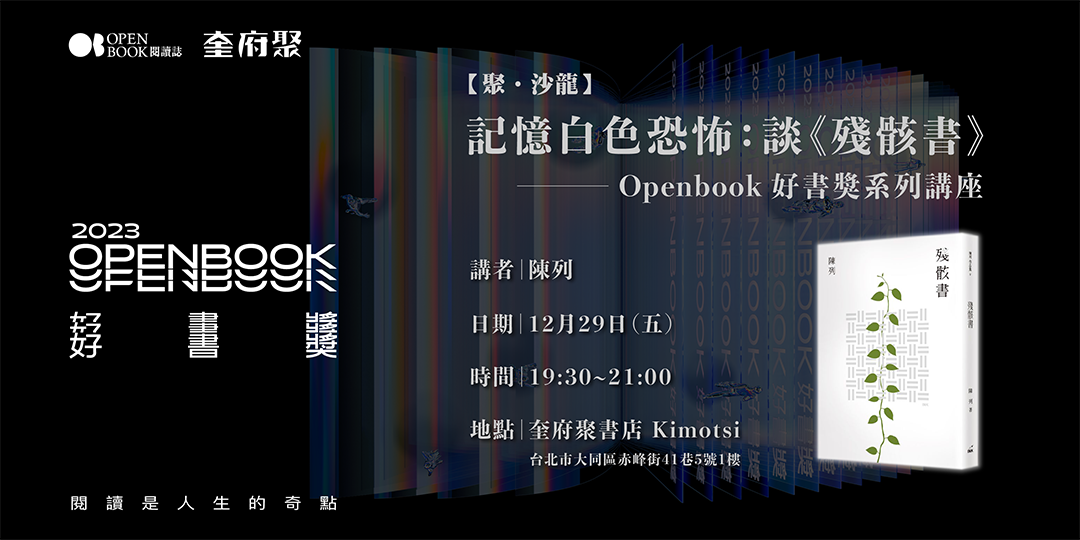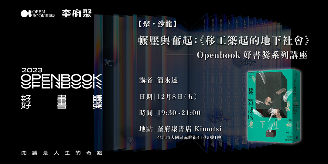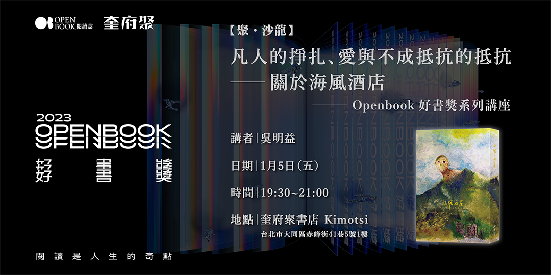 2023年Openbook好書獎來到了第7年。奎府聚書店「聚.沙龍」特別與Openbook合作,舉辦好書獎系列講座,邀請簡永達、黃瀚嶢、陳列、吳明益等四位2023年好書獎得主,在週五夜晚,談他們的創作與關懷。
