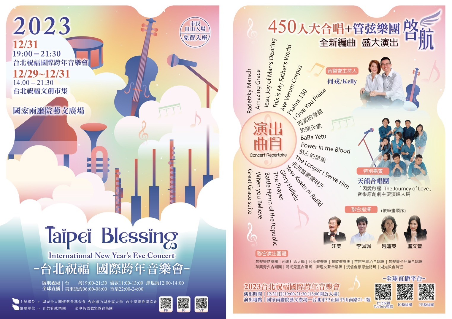 🎼提供給全球華人不一樣的跨年選擇! 「台北祝福國際跨年音樂會」如同維也納新年音樂會般地,就在國家兩廳院廣場,齊聚 「 音契管弦樂團」、「內湖社區大學」、「台北聖樂團」、「音契青少兒童合唱團」、「華興青少合唱團」、「宇宙光愛心合唱團」、「湖光兒童合唱團」、「豐收聖樂團」、「浸信會懷恩堂詩班」、「湖光教會詩班」 、「衛理女聲合唱團」等11個團體,組成450人史無前例的大型合唱團與管絃樂團共同演出,以主題「啟航」,透過曲曲耳熟能詳的古典經典名曲,在台北為全球華人開唱,撫慰人心獻上祝福,幫助人們的心靈重新得著力量、信心和盼望,市民免費入場,歡迎一起度過一個充滿平安與祝福的跨年夜!