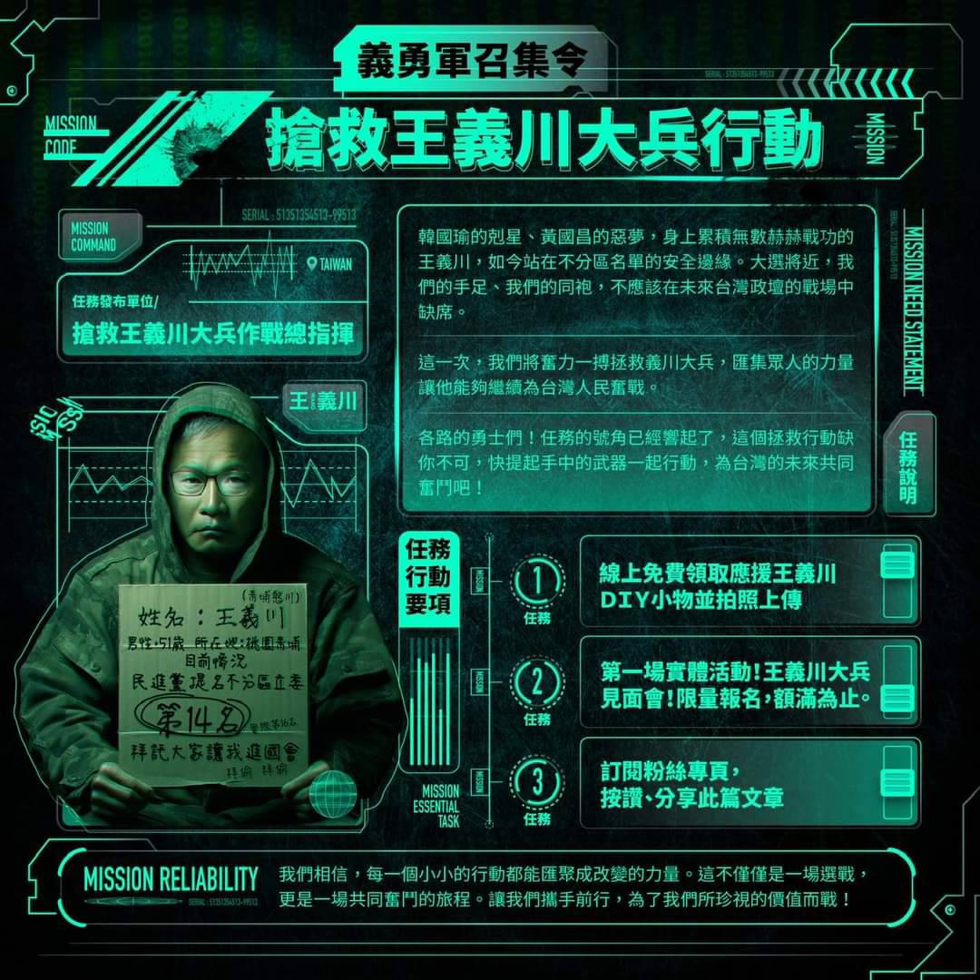 - 韓國瑜的剋星、黃國昌的惡夢-身上累積無數赫赫戰功的王義川,如今站在不分區名單的安全邊緣大選將近 我們的手足、我們的同袍,不應該在未來台灣政壇的戰場中缺席這一次,我們將奮力一搏拯救義川大兵匯集眾人的力量讓他能夠繼續為台灣人民奮戰!||各路的勇士們||- 任務的號角已經響起了,這個拯救行動缺你不可 -快提起手中的武器一起行動,為台灣的未來共同奮鬥吧!- 主辦單位:搶救王義川大兵計畫團隊 -