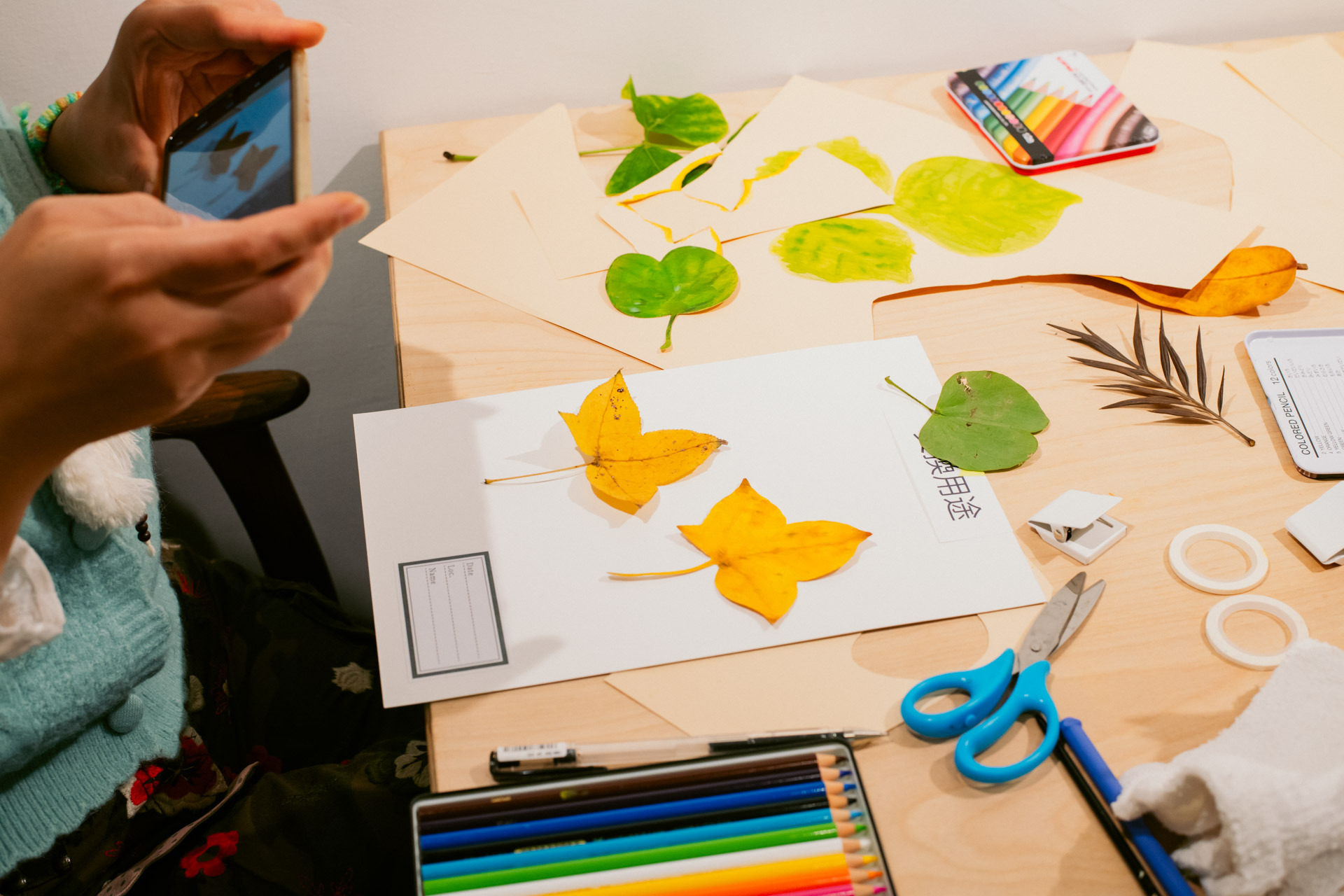 本活動中,將收集到的樹葉外型、顏色與紋路描繪在在圖畫紙上製作「紙樹葉標本」。