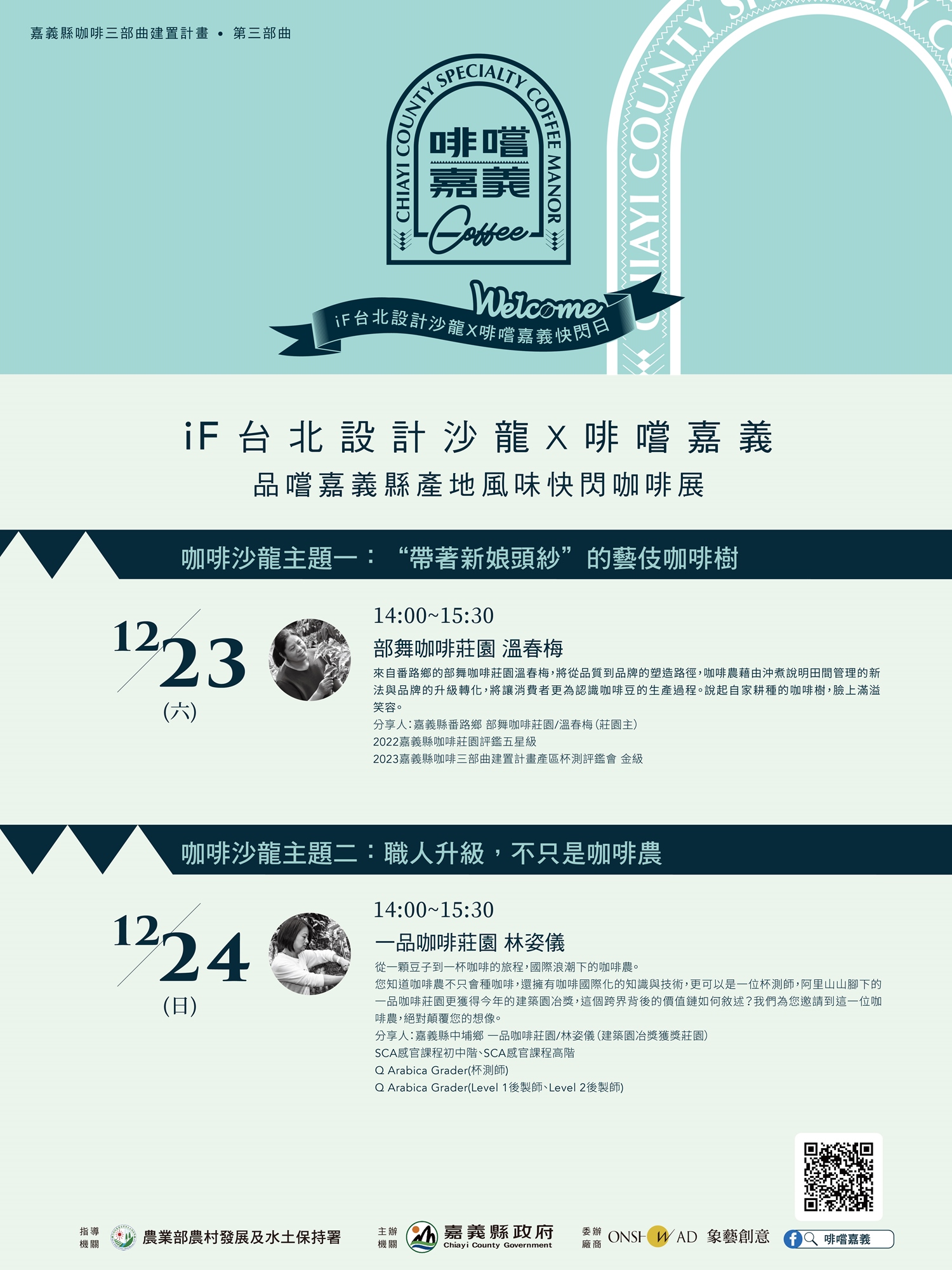 【活動方法】產地品牌展覽活動時間:2023年12月23日(六)-24日(日),期間邀請嘉義縣咖啡農講解沖煮精品咖啡外並沖煮嘉義好味道。