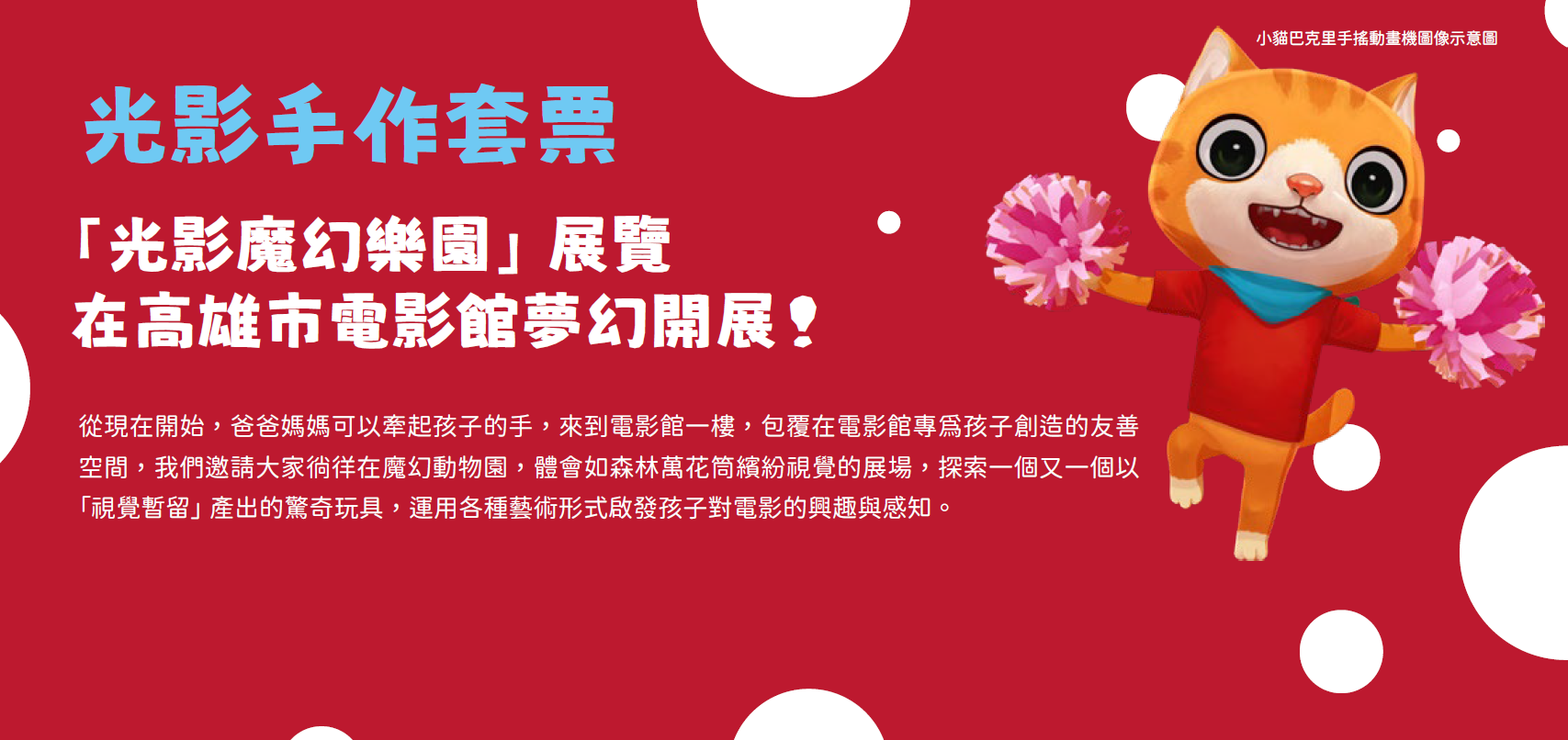 高雄市電影館於開展隔日1/20(六)舉辦【光影手作課】特別體驗場,本場享專人導覽「光影魔幻樂園」,人人更可動手體驗,帶回一台「小貓巴克里」超Q手搖動畫機!快和爸爸媽媽一起動手組裝「小貓巴克里」動起來的超Q手搖動畫機吧!