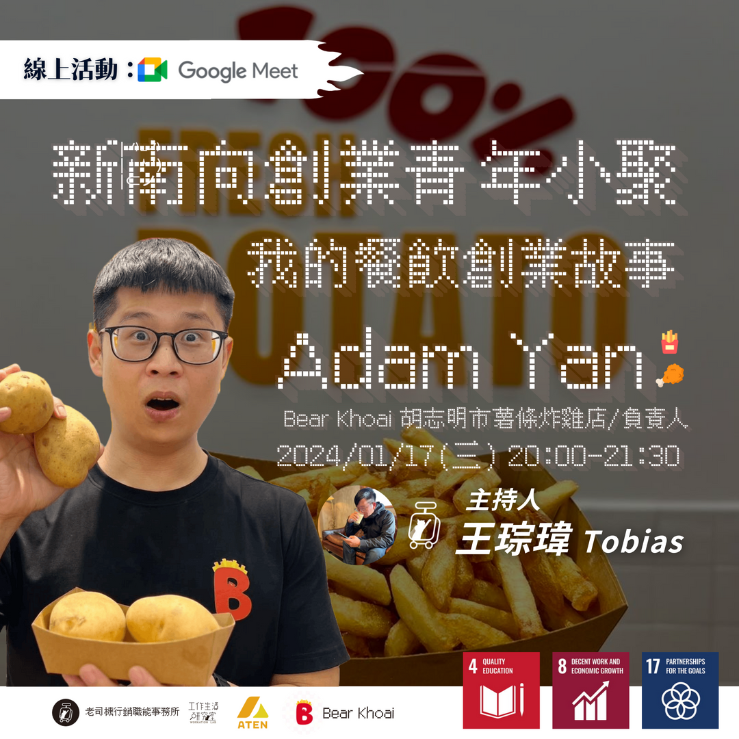 特別邀請到胡志明市知名品牌Bear Khoai薯條炸雞店的創辦人Adam Yan,將與大家分享他在越南當地打拼的獨特心路歷程。透過這場線上交流,你將有機會深入瞭解新南向市場的商機、挑戰,以及創業心得的關鍵要素。無論你是已經在新南向地區經營,還是正打算進軍這片市場的創業者,都能在這次活動中獲得實用的經驗分享,啟發自己的創業夢想。