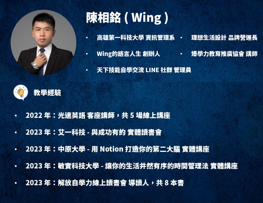 1. 由專業講師 Wing 導讀分享、帶討論,並引導學員主動思考和輸出、絕對是乾貨滿滿,收穫更滿