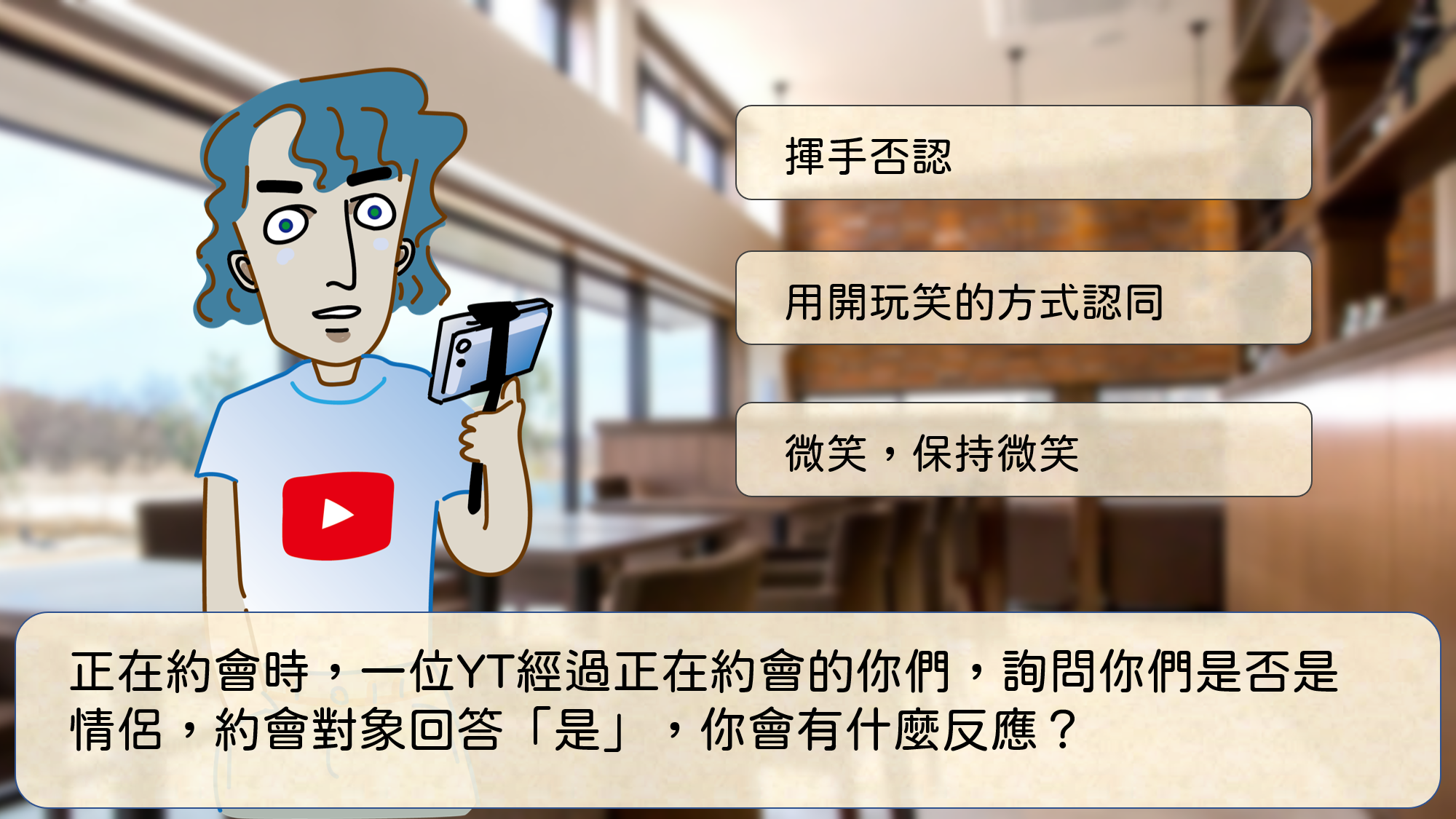 - 本遊戲非聯誼活動,因此不會有配對環節,但遊戲中仍會有需與他人交流階段。