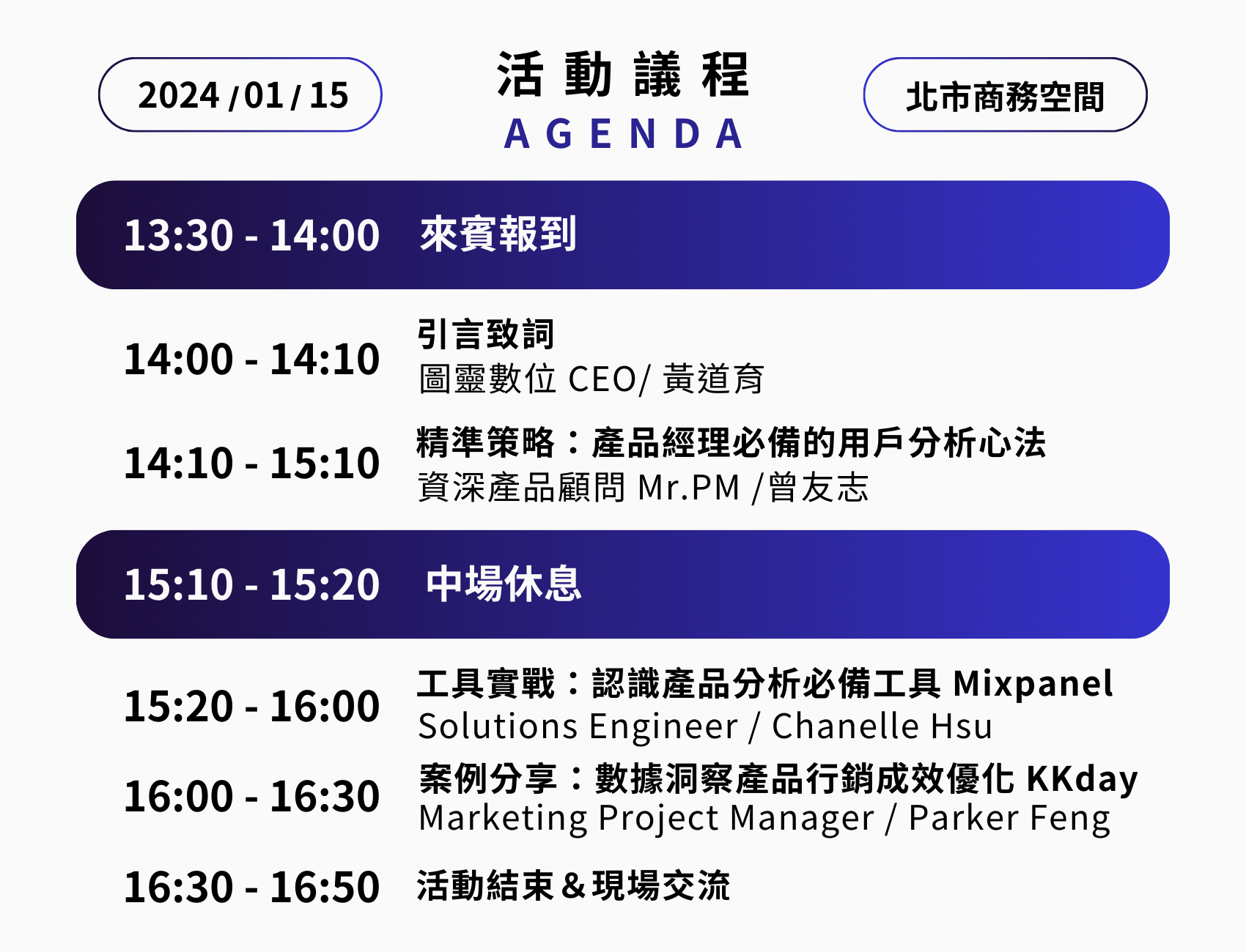 本次活動由業界資深產品顧問 曾友志 老師、使用者為核心的知名產品分析工具 Mixpanel、亞洲最大旅遊體驗平台 KKday 分享產品經理必知的用戶分析經驗、實際操作分析工具及成功案例分享,共同引領產品運營相關人員制定具前瞻性產品成長的關鍵策略。