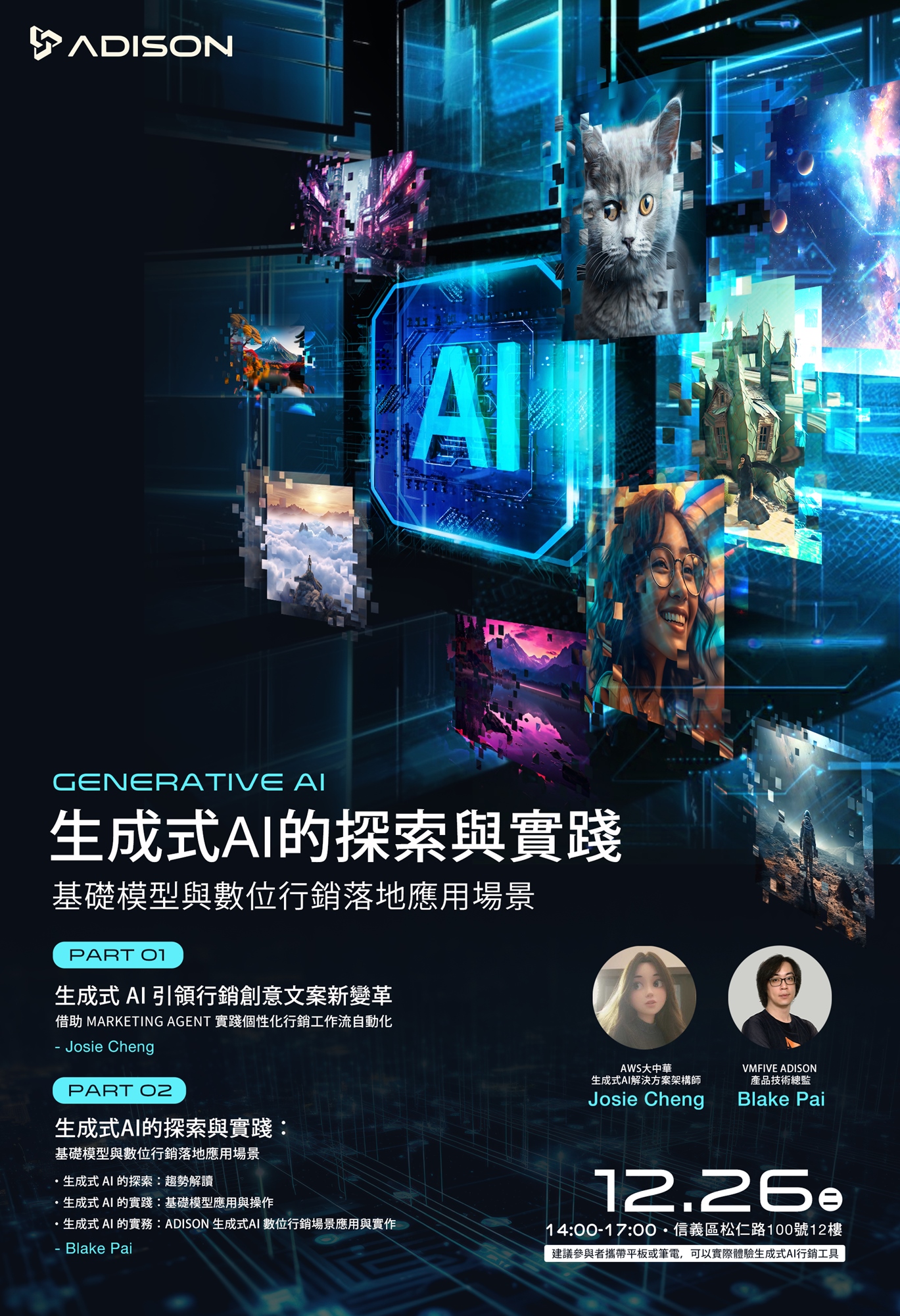 本活動將邀請AWS大中華生成式AI解決方案架構師Josie Cheng和VMFIVE ADISON產品技術總監Blake Pai兩位專家,分享生成式AI在行銷領域的最新趨勢與應用。