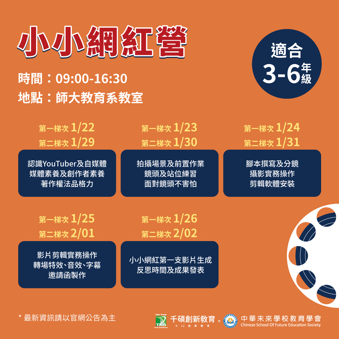 TKB千碩創新教育團隊偕同臺灣師範大學科技系產學合作,專為國小生依108課綱素養導向設計的網紅營隊,將孩子興趣與新課綱素養做結合,除影片創作者本身須具備的技能如:頻道定位、主題選材、腳本設計、拍攝剪輯手法等技能,更重要的是孩子的「態度」養成,決定做一個如何正向影響社會的人,更是身為網紅重要的精神之一。