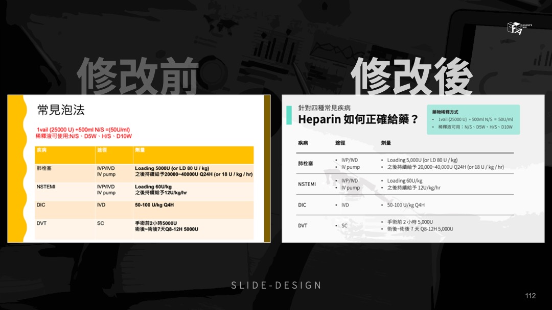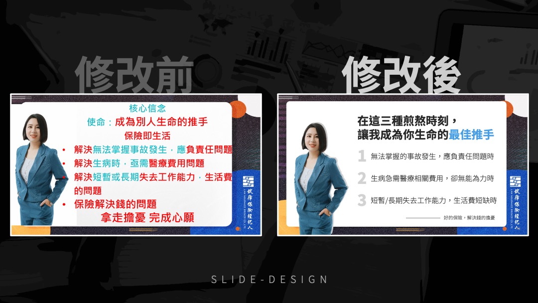 「不得不說老師簡直是簡報界的整形醫師,每一份一頁一段簡報的內容,給老師重新詮釋後都猶如換了一張面容重獲新生,不只有顏值又有氣質,這樣內外兼備的簡報放映在大眾眼前,真的要不出眾都難。」(全文閱讀)