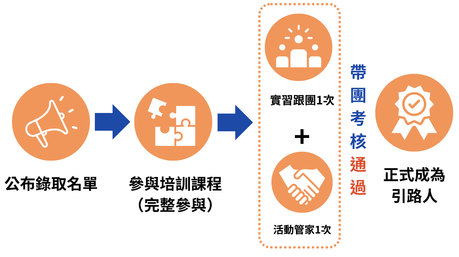 參與培訓課程 ► 實習跟團 ► 成為活動管家 ► (申請考核) ► 帶團考核 ► (考核通過) ► 成為引路人
