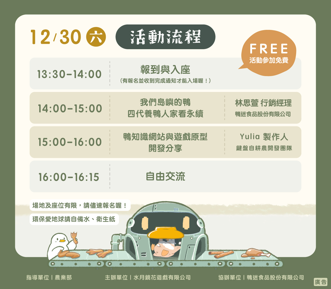 除此之外,也會由「鍵盤自耕農」團隊來聊聊,如何將艱深的鴨子歷史、養殖等資訊,轉化並製作成一般人也能輕易了解的食農教育知識網站,並體驗目前正在開發的養鴨遊戲原型DEMO 🎮