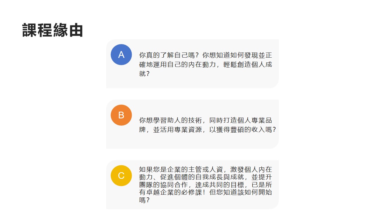 如果您是企業的主管或人資,激發個人內在動力、促進個體的自我成長與成就,並提升團隊的協同合作,達成共同的目標,已是所有卓越企業的必修課!但您知道該如何開始嗎?
