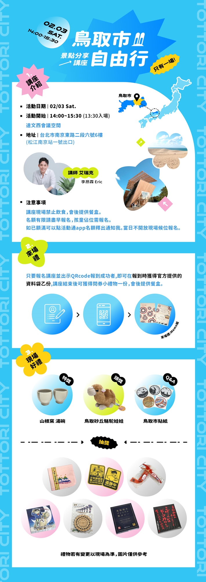 想了解鳥取市及東部自由行交通的旅客,下一次旅行怎麼計畫?本次活動將分享鳥取市的景點情報,只有現場才能參與抽獎好康,機會難得快來報名!