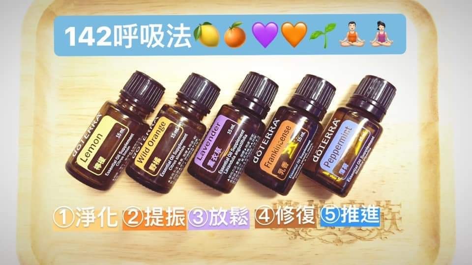 邀請大家一起開始做「142香氛呼吸養生法」,她特地從許多精油中挑出了最佳的組合之一分享給大家,從第一個精油到第五個精油依序是檸檬、野橘、薰衣草、乳香,最後是薄荷,每支精油都依序做一次142呼吸,一開始入門時也可以先從柑橘類精油+薄荷或乳香+柑橘類精油練習,當然,也可以選擇自己喜歡的精油,只要持續做「142香氛呼吸法」,每個人都會感受到美好的事正在發生!