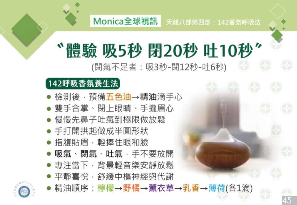 想健康,就從一呼一吸開始,香氛療癒室主持人Nina大力推廣142香氛呼吸養生法,正確呼吸加上專業純正調理級的好精油,就如武俠小說中的雙劍合壁,效果誰與爭鋒!