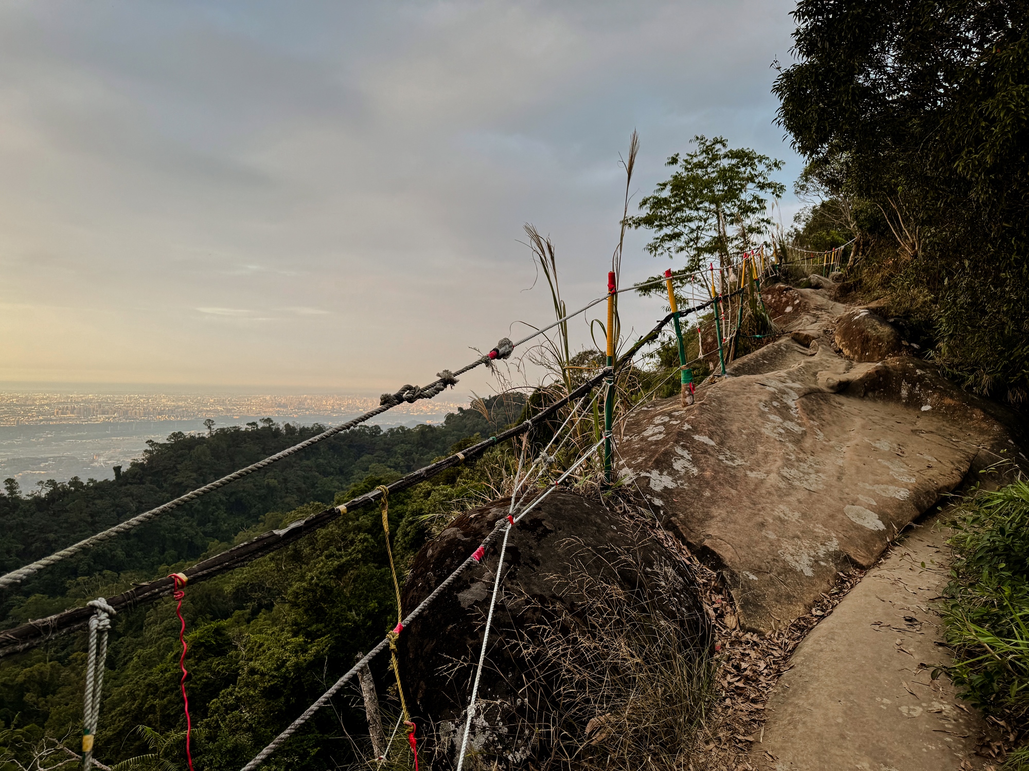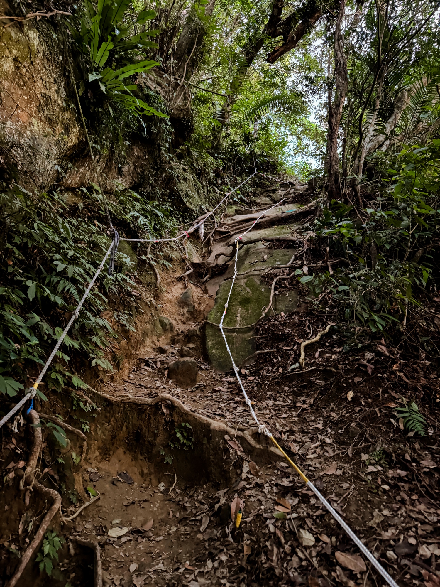 沿途石階落差大且濕滑,陡上約1 小時開始碰到部分拉繩及瘦稜地形,