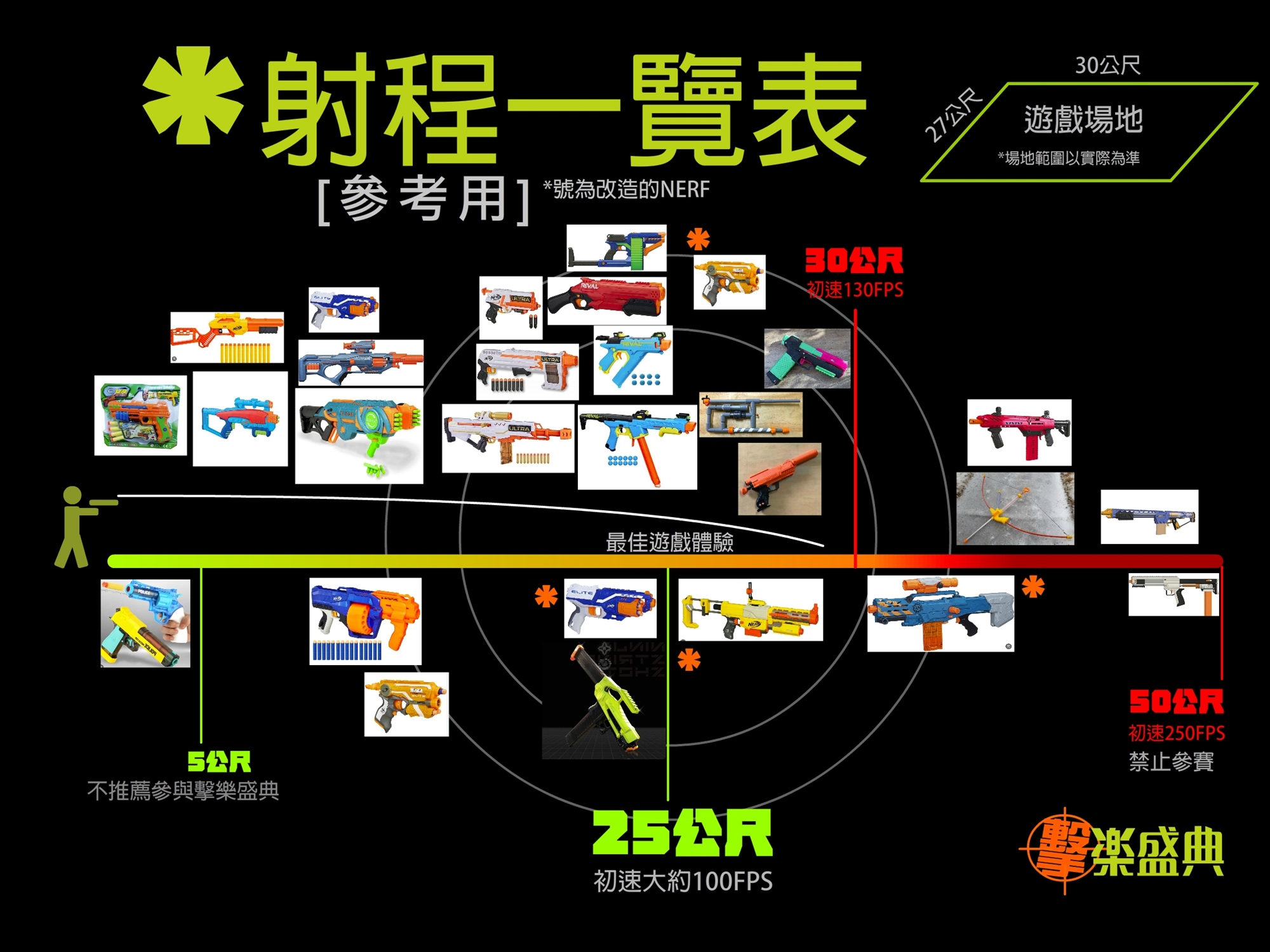 泡綿彈發射器,130FPS是上限 . (簡易測試方式為:打破3張A4紙張不合格不能參賽)現場會做測試,測試過關才下場遊戲.