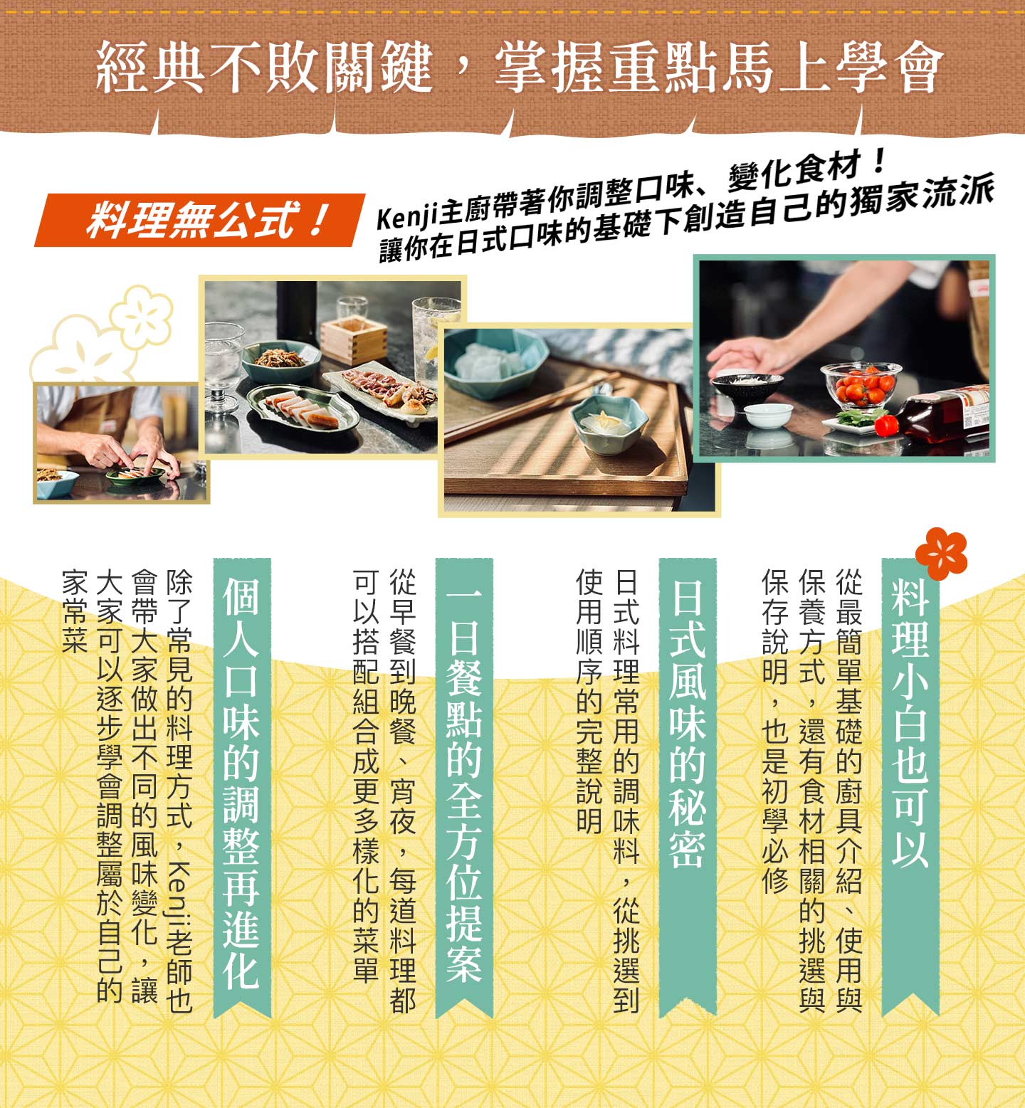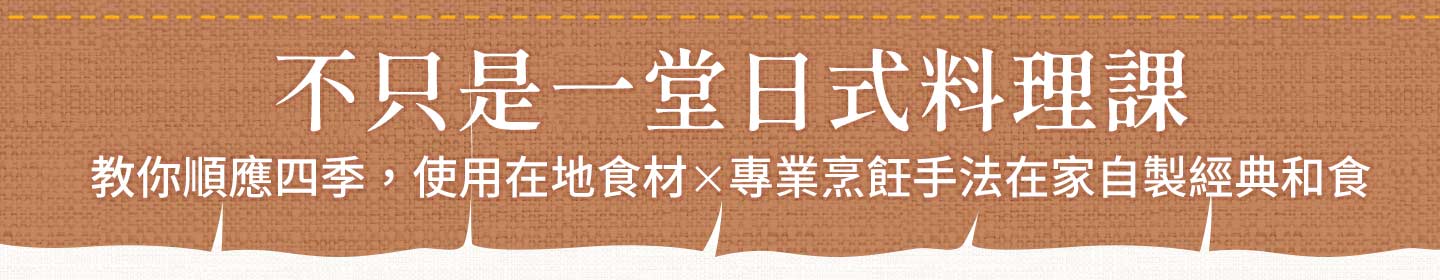 論物產的豐饒性,其實台灣也不遑多讓,曾擔任日本餐飲集團總料理長的Kenji老師,將會在這堂課中教你如何善用台灣在地食材,學習日本職人的烹調手法,做出一道道濃厚日風的美味佳餚,從早到晚、滿足喜愛日本文化的你。