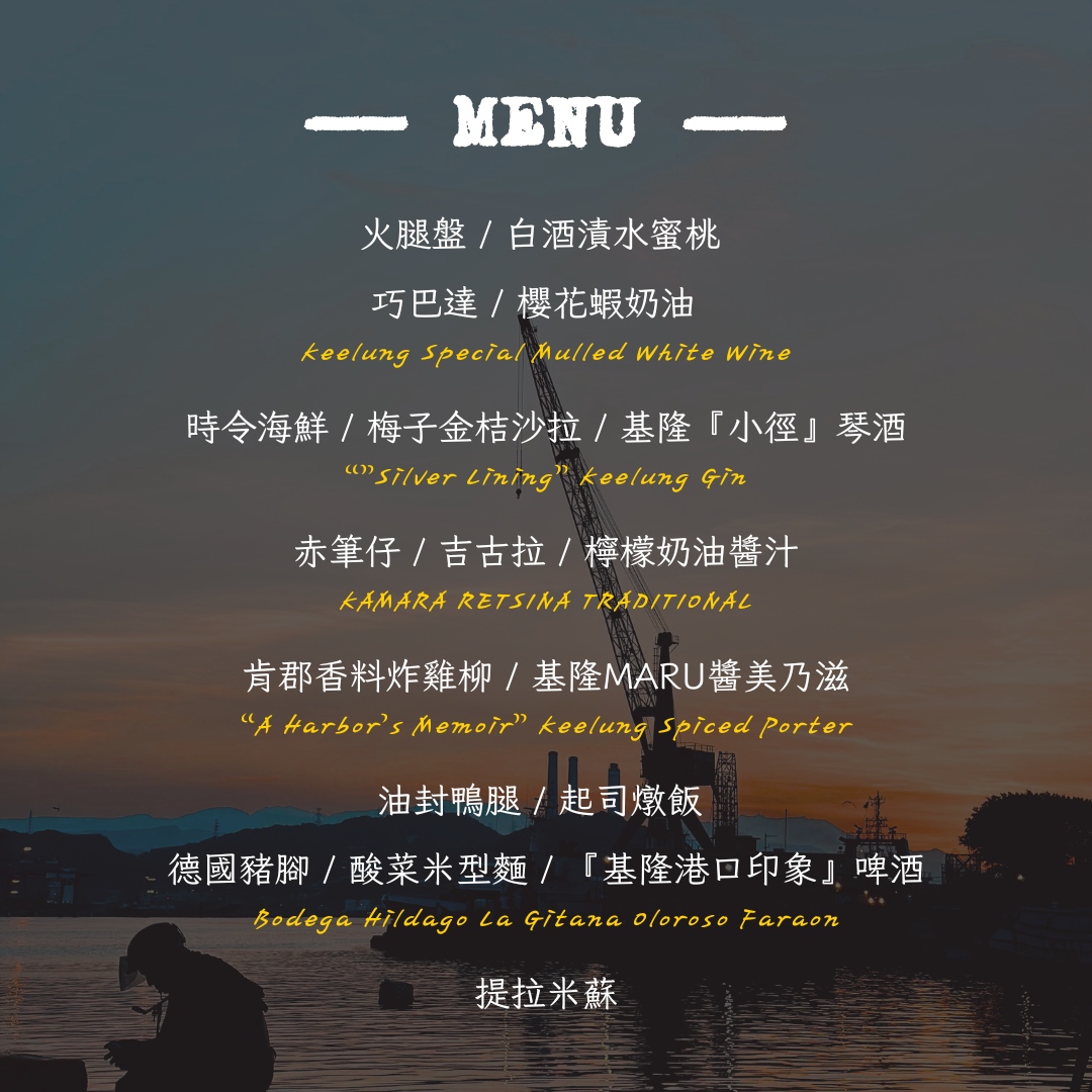 在搭配酒款上,除了兩款基隆主題酒款之外,還有為基隆氣候風土設計的基隆香料熱白酒;搭配海風吹拂、柑橘清新中帶著微鹹感的希臘松香白酒;以香料貿易的航海時代為靈感的雪莉酒Oloroso,與餐點風味搭配的同時,也用酒款帶大家體驗不同的基隆面向。