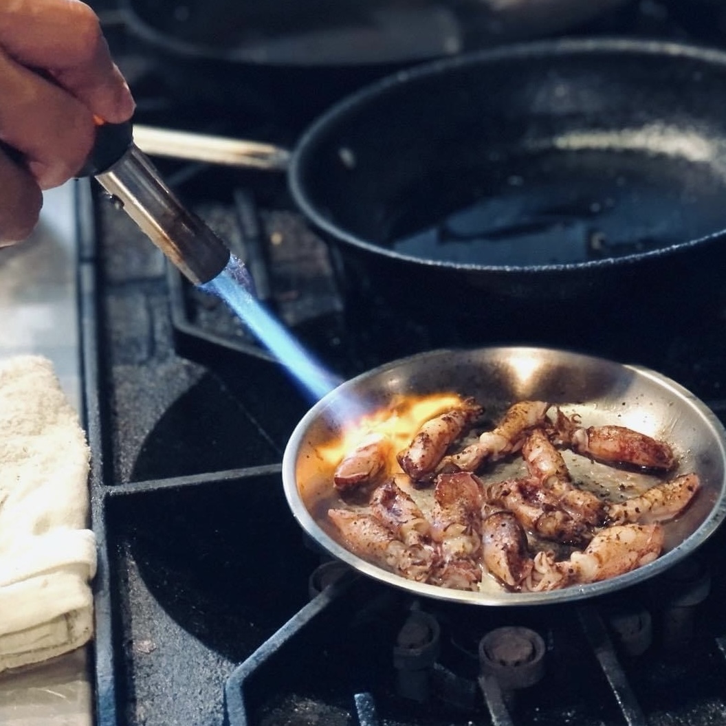 這次的餐點為主廚特別為這次的主題所設計,不僅大量使用在地漁貨物產,還特別用了兩款基隆主題酒款:『小徑』基隆琴酒、『基隆港口印象』香料啤酒入菜,將小徑琴酒中極具特色的山海風味融入海鮮沙拉的醬汁當中,以及使用香料波特啤酒燉煮的德式豬腳,用嶄新的方式來詮釋基隆風土。