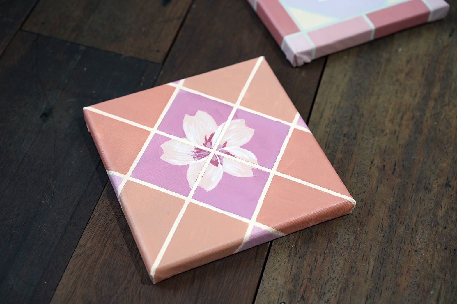 將花磚中的各個組成元素,轉換後簡化成幾何圖形,並透過紙膠帶遮擋進行繪製,畫好線條後撕掉紙膠帶。
