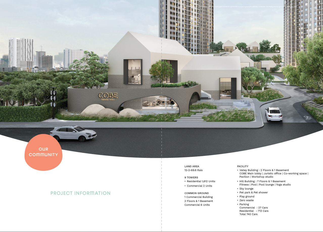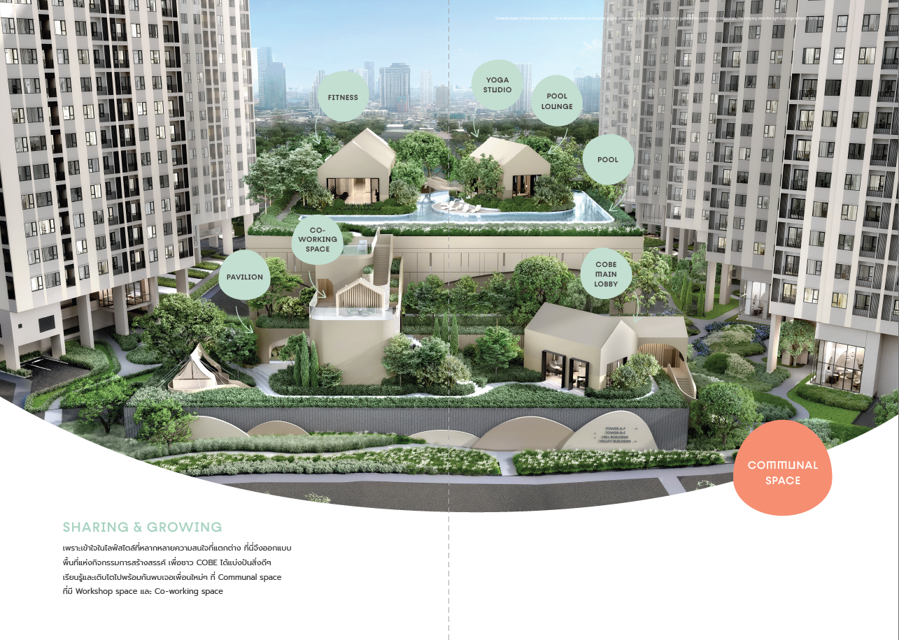泰國知名建商SC Asset為新一代年輕人所推出的全新品牌,專為發展社區生活形態的居住空間而設計。其最大特色是它的社區活動,你可以參加各種興趣社團,如咖啡愛好者、遊戲愛好者、寵物愛好者等,與志同道合的人交流和學習。也可以參與市集活動,買賣你的手工藝品或二手物品,或者享受心理健康諮詢等服務,讓你的心靈得到療癒。COBE的主要目標是為都會人口創造出卓越的公共空間,並致力於打造一個永續的居住社區。