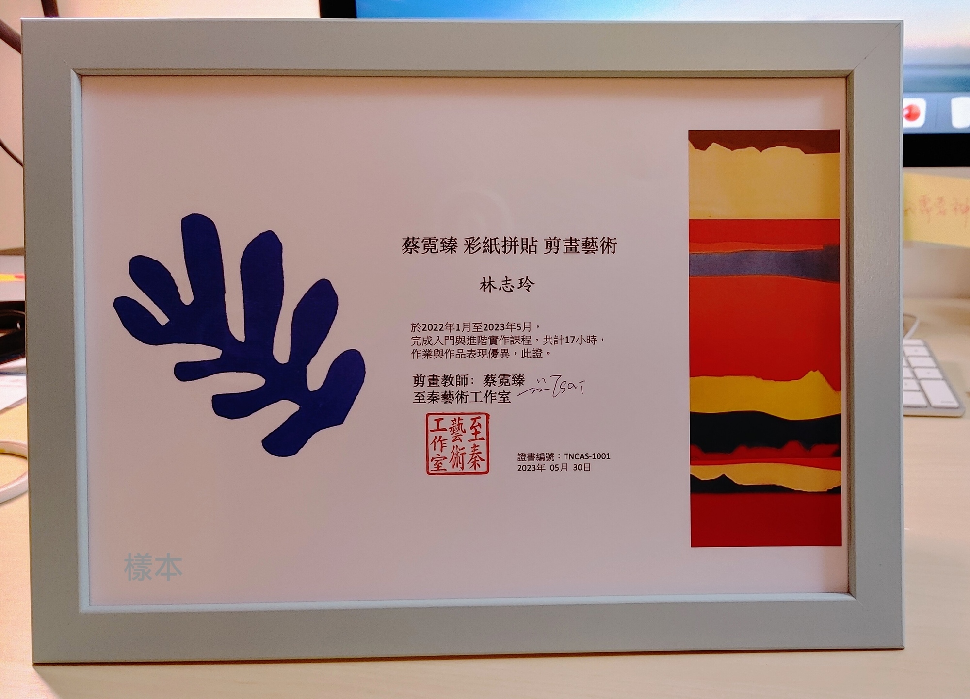 馬蒂斯彩紙拼貼畫作推廣學習,這兩年來受到注目與肯定,對於從事教育的老師與社工,心理輔導與物理治療師等,了解色彩藝術對人的感受是有幫助的,也增加了親子活動,在家裡教小孩子剪剪貼貼增添生活趣味,這兩年畢業學生在2024年2月與蔡老師一同參與畫展,將所學的展現出藝術畫作,與大家同歡共賞。