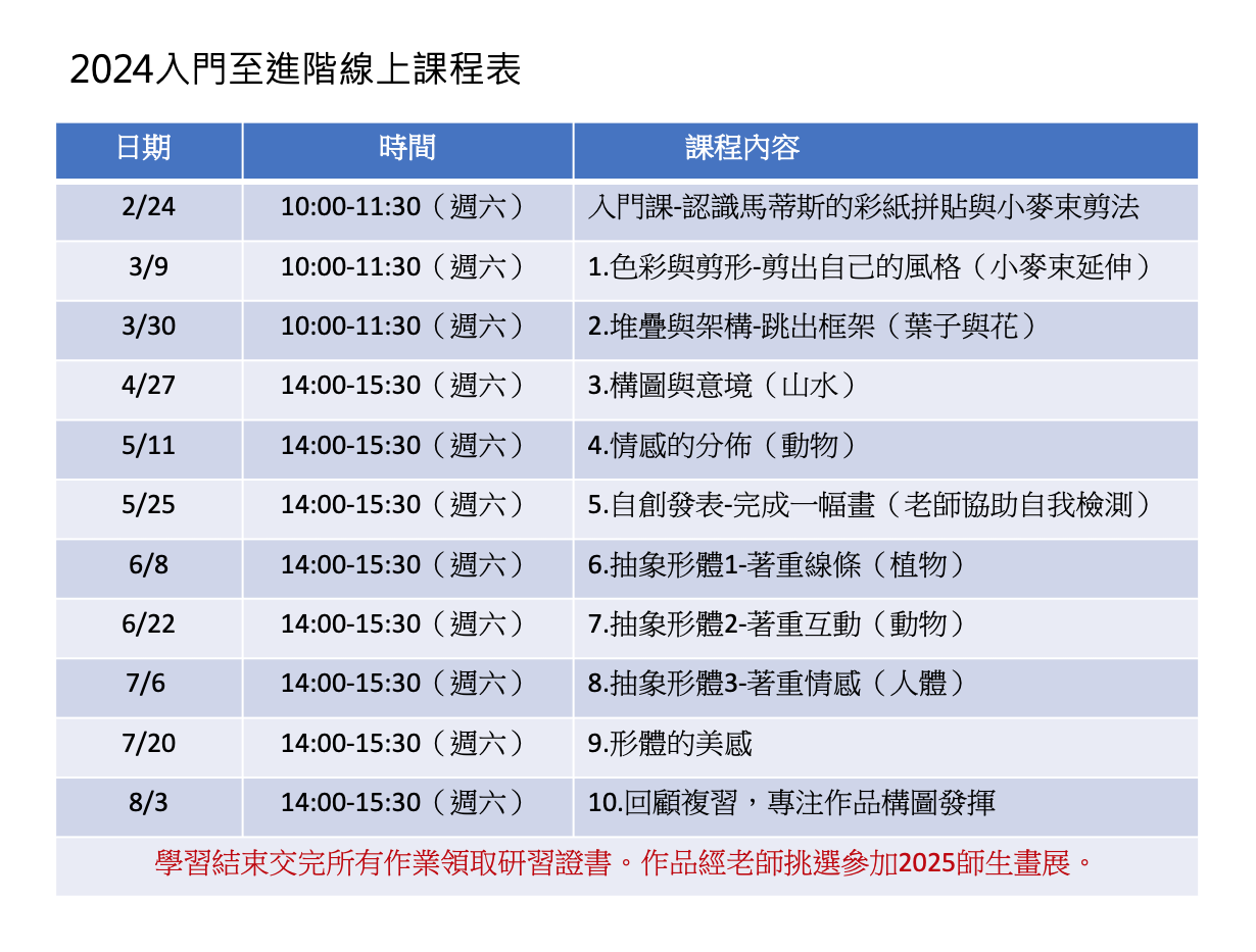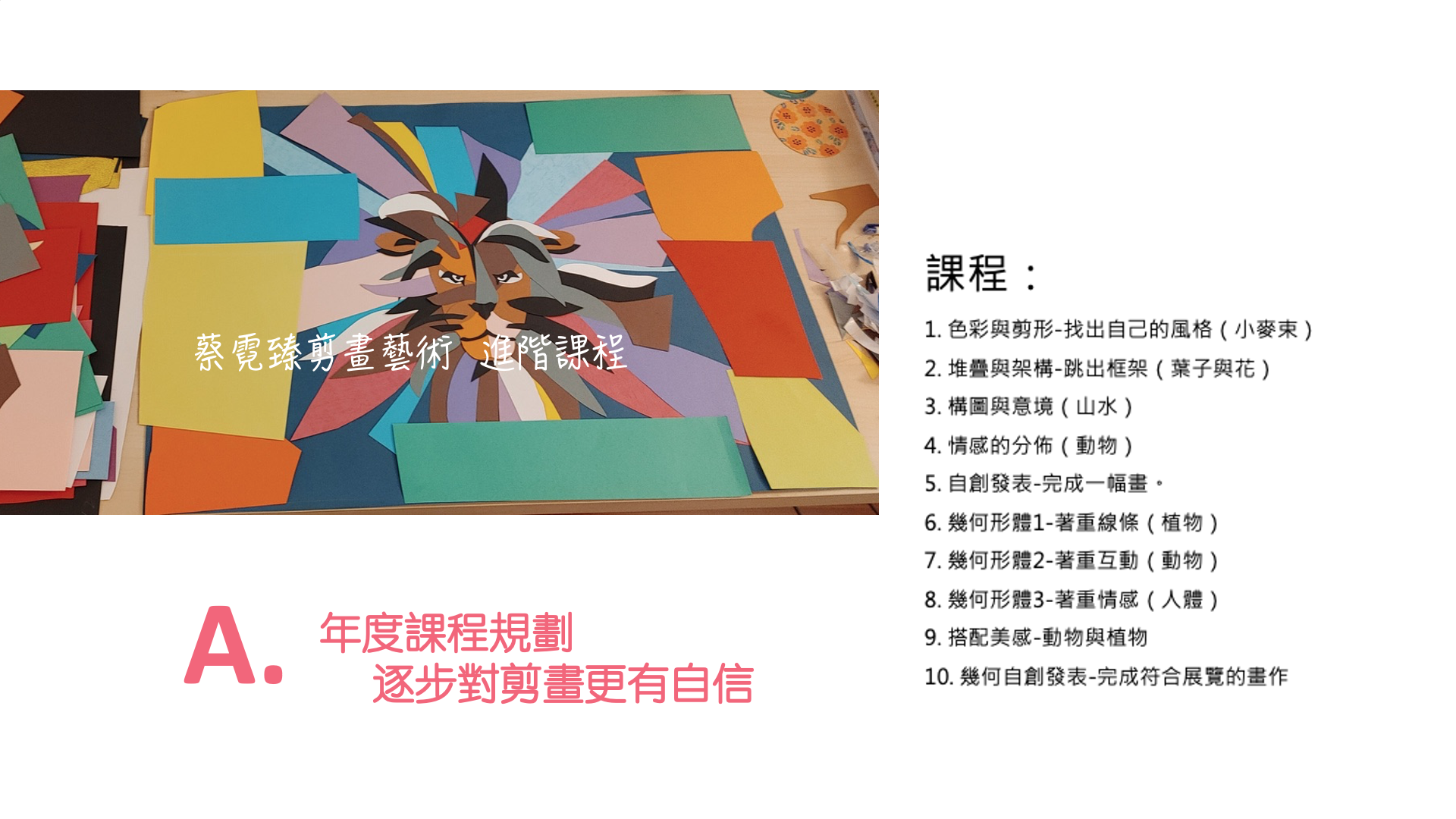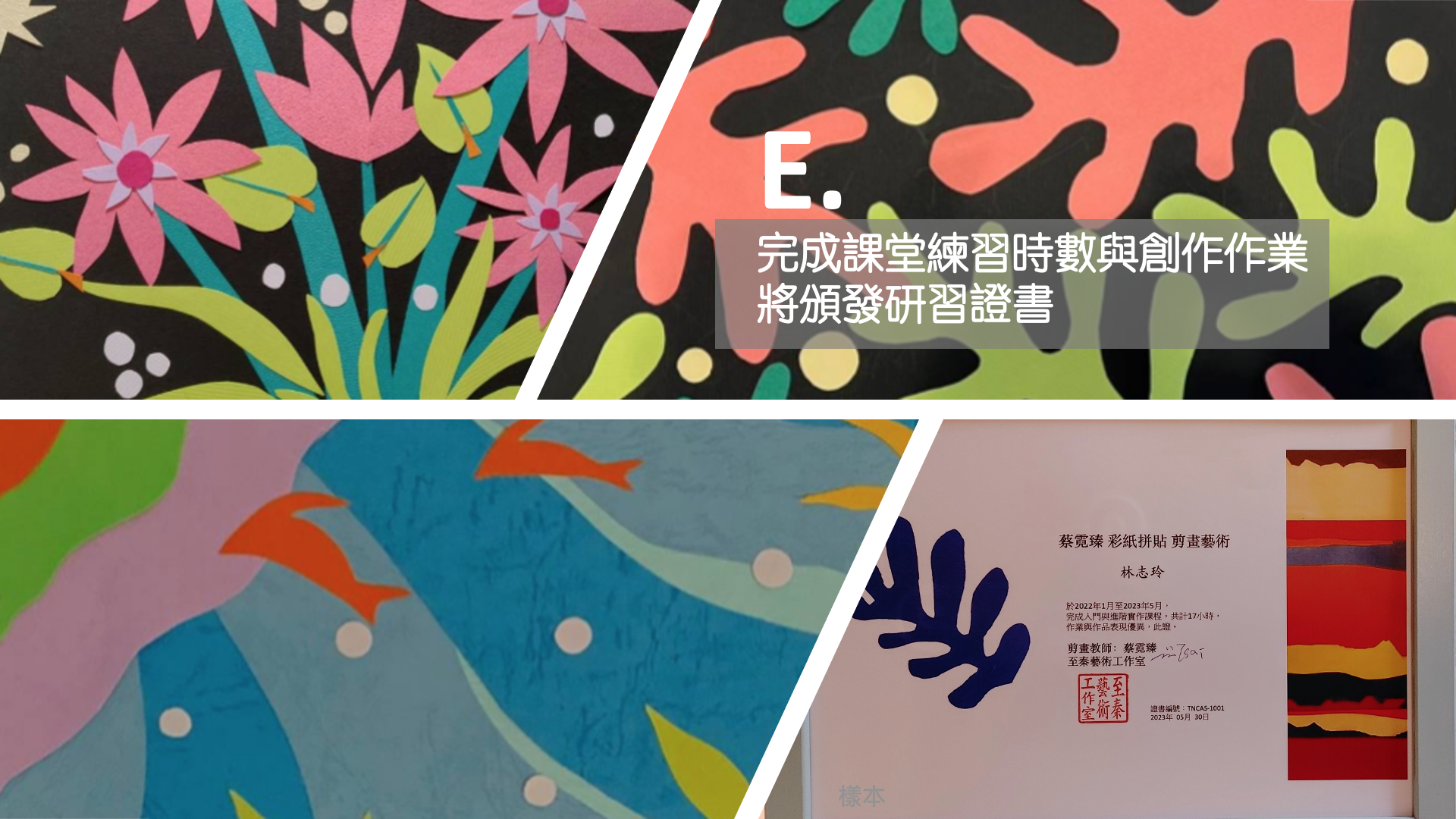 進階級-剪畫藝術色彩的應用,紙張構圖與拼貼,形體的剪裁與層次,製作多樣的剪畫作品。共有10堂課,繳交課堂與課後作業與作品,完成課堂練習,於老師畫展上展示畢業作品,取得進階級研習證明。