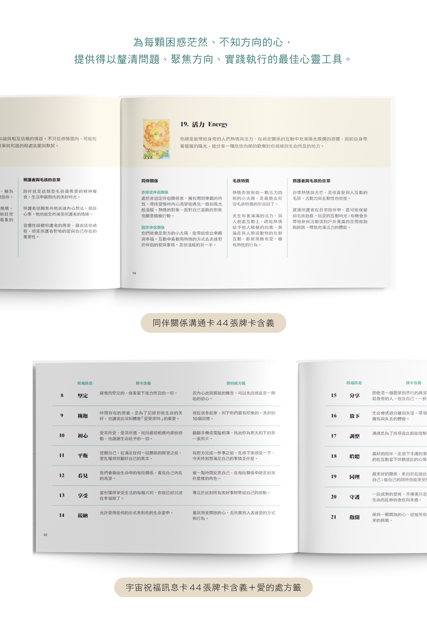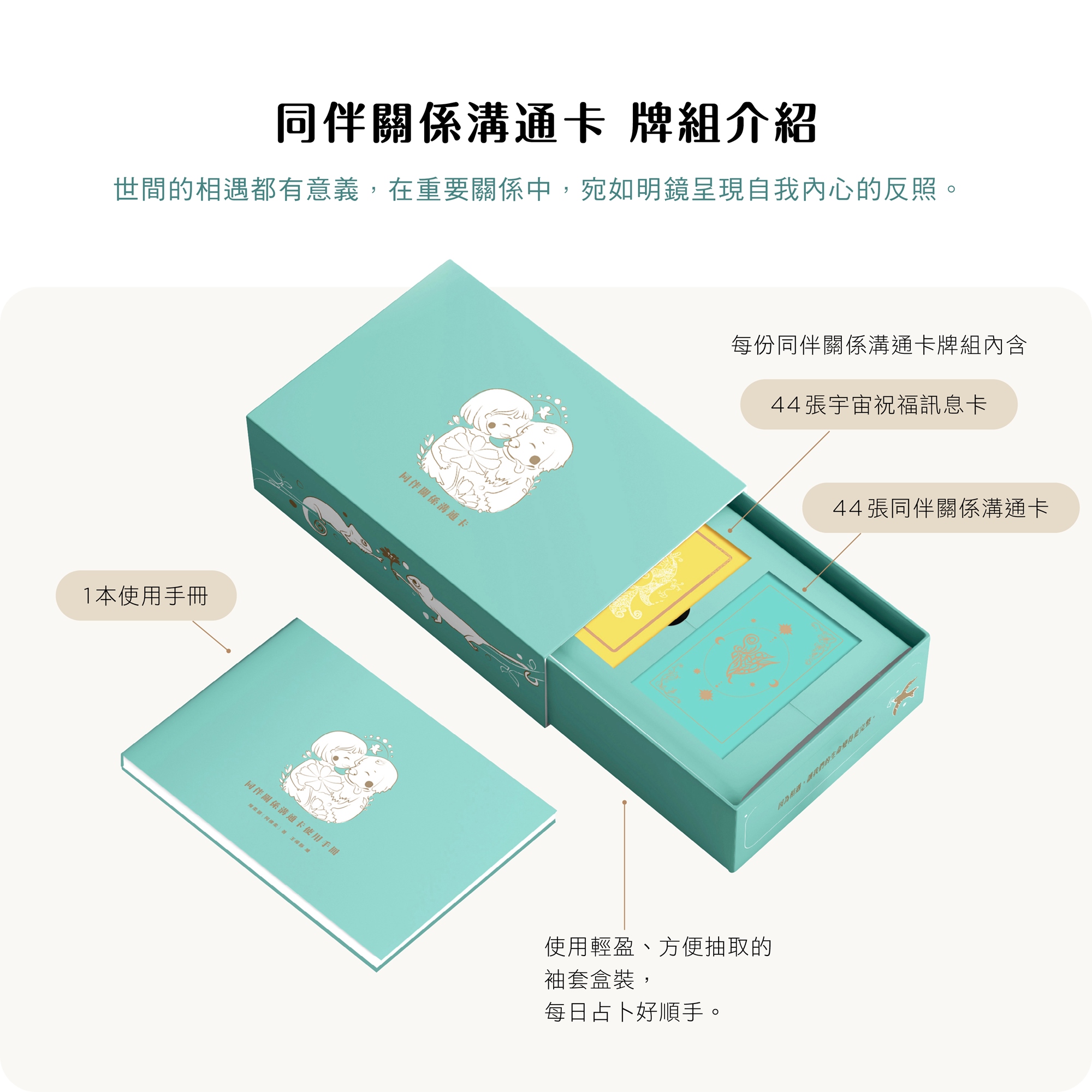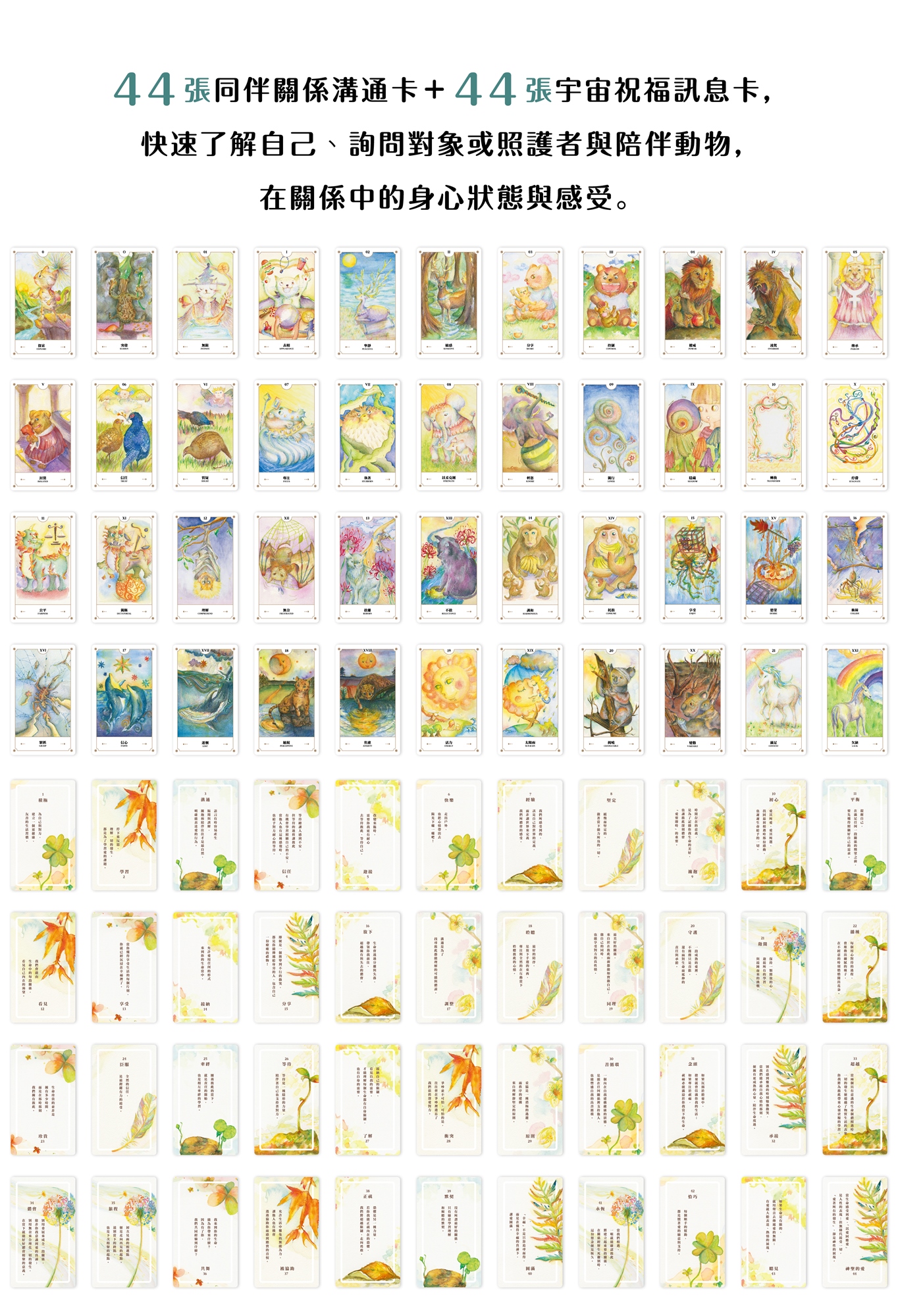 44張同伴關係溝通卡+44張宇宙祝福訊息卡+精美全彩使用手冊,快速了解自己、詢問對象或照護者與陪伴動物,在關係中的身心狀態。即使是完全沒有經驗的新手小白也可以快速上手!