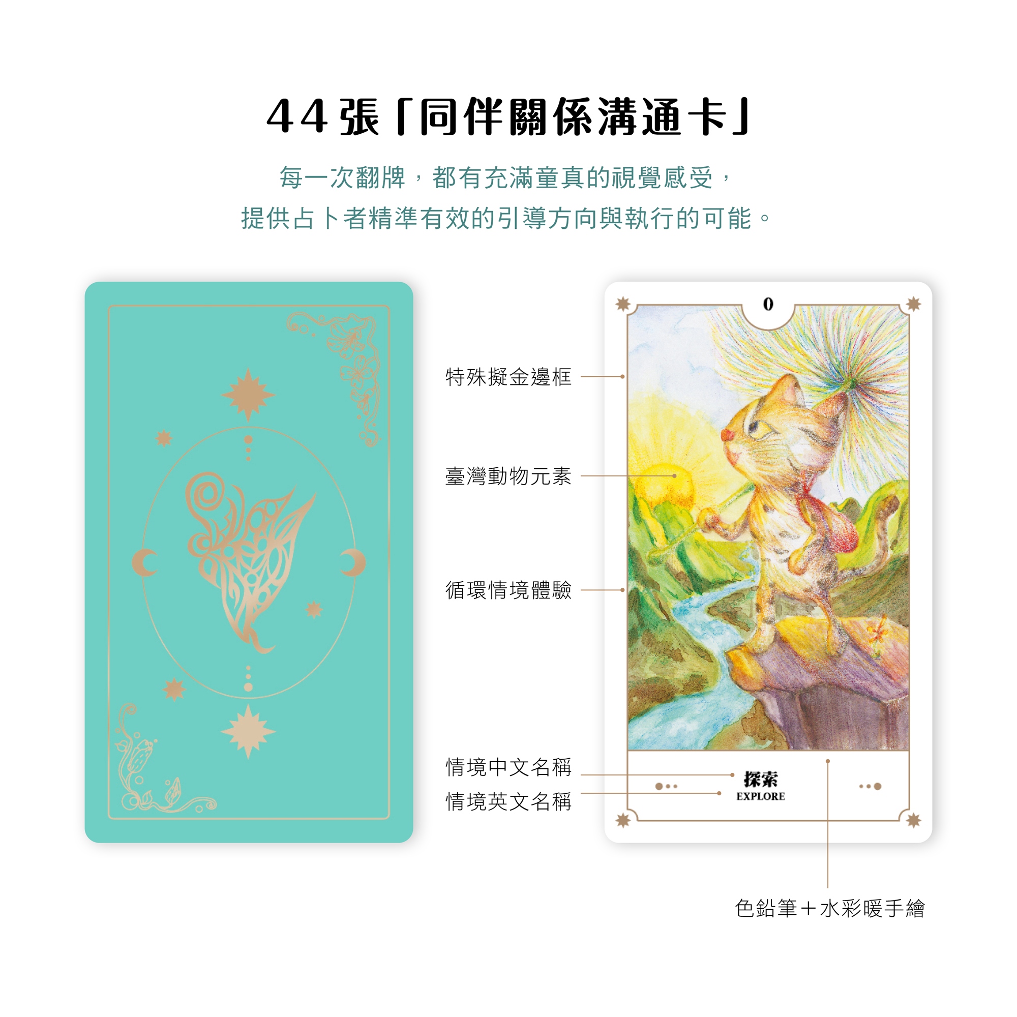 本套「同伴動物關係卡」將22股情境式的循環經驗,結合探尋心靈智慧的生命之旅,系統性展現在44張牌卡圖像中,刻畫出和諧/失衡的能量關係下所呈現的牌面意義。