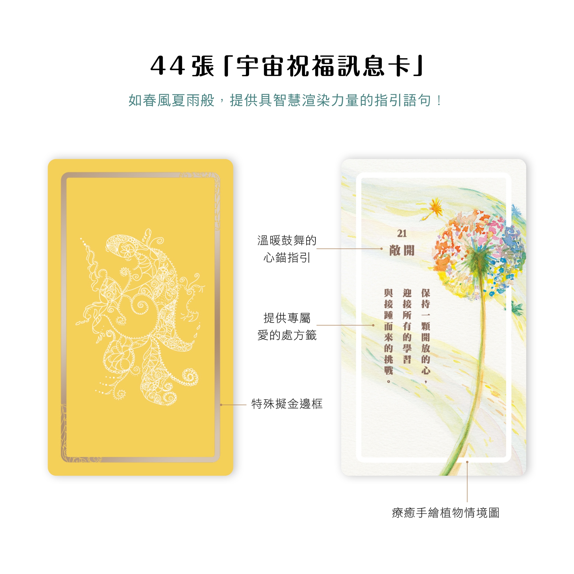 超越市售只運用於占卜或眾多類別的訊息卡,只需一套牌卡就能滿足使用者的多方面需求,即便是完全沒有任何牌卡學習經驗的人,也能馬上上手、練習占卜,甚至透過訊息卡就能直接理解與詮釋牌卡的提醒。