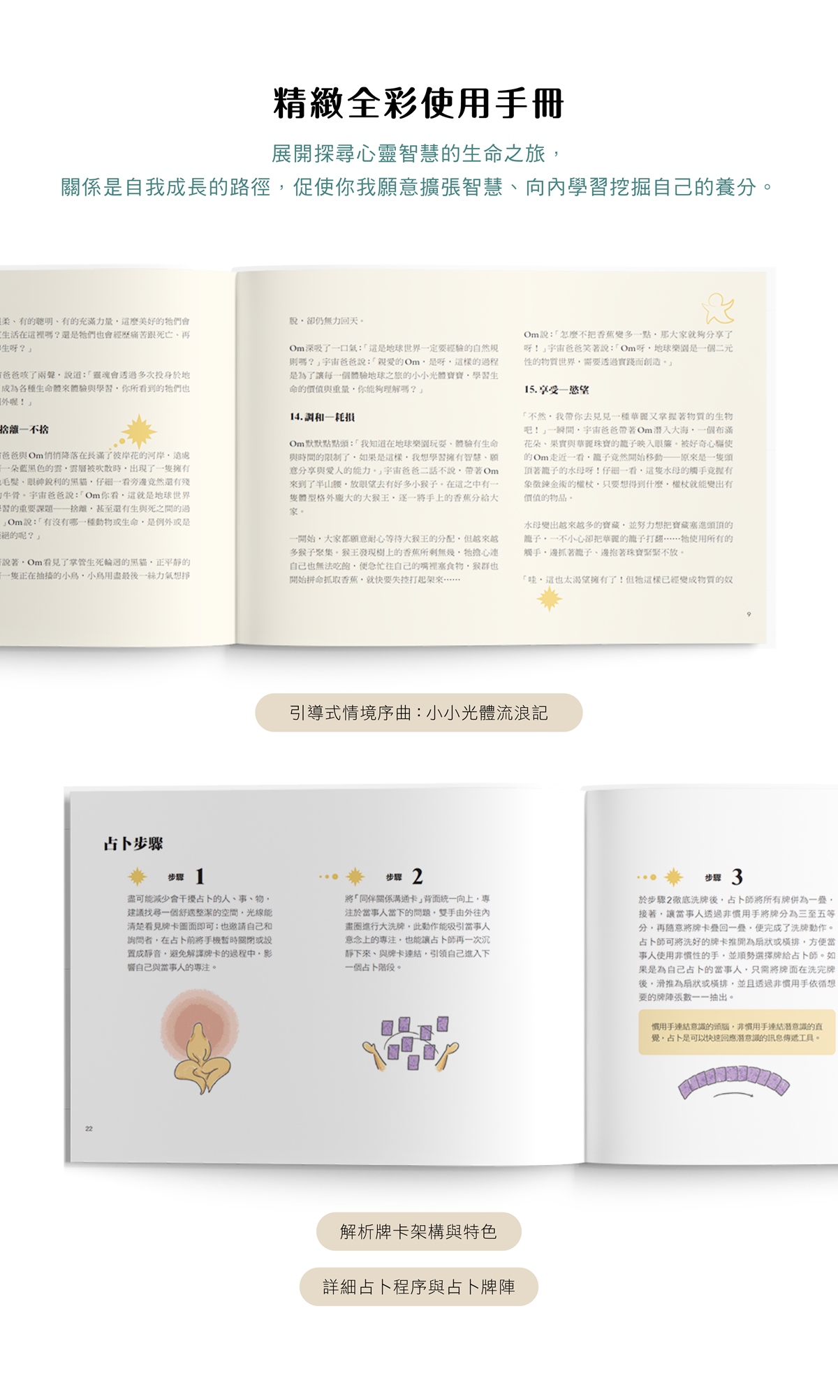 210 x 142mm的精緻全彩使用手冊,內含小小光體流浪記(引導式序曲故事)、牌卡架構與特色、占卜程序、占卜牌陣、「同伴關係溝通卡」牌卡含義、「宇宙祝福訊息卡」牌卡含義與愛的處方籤等內容。