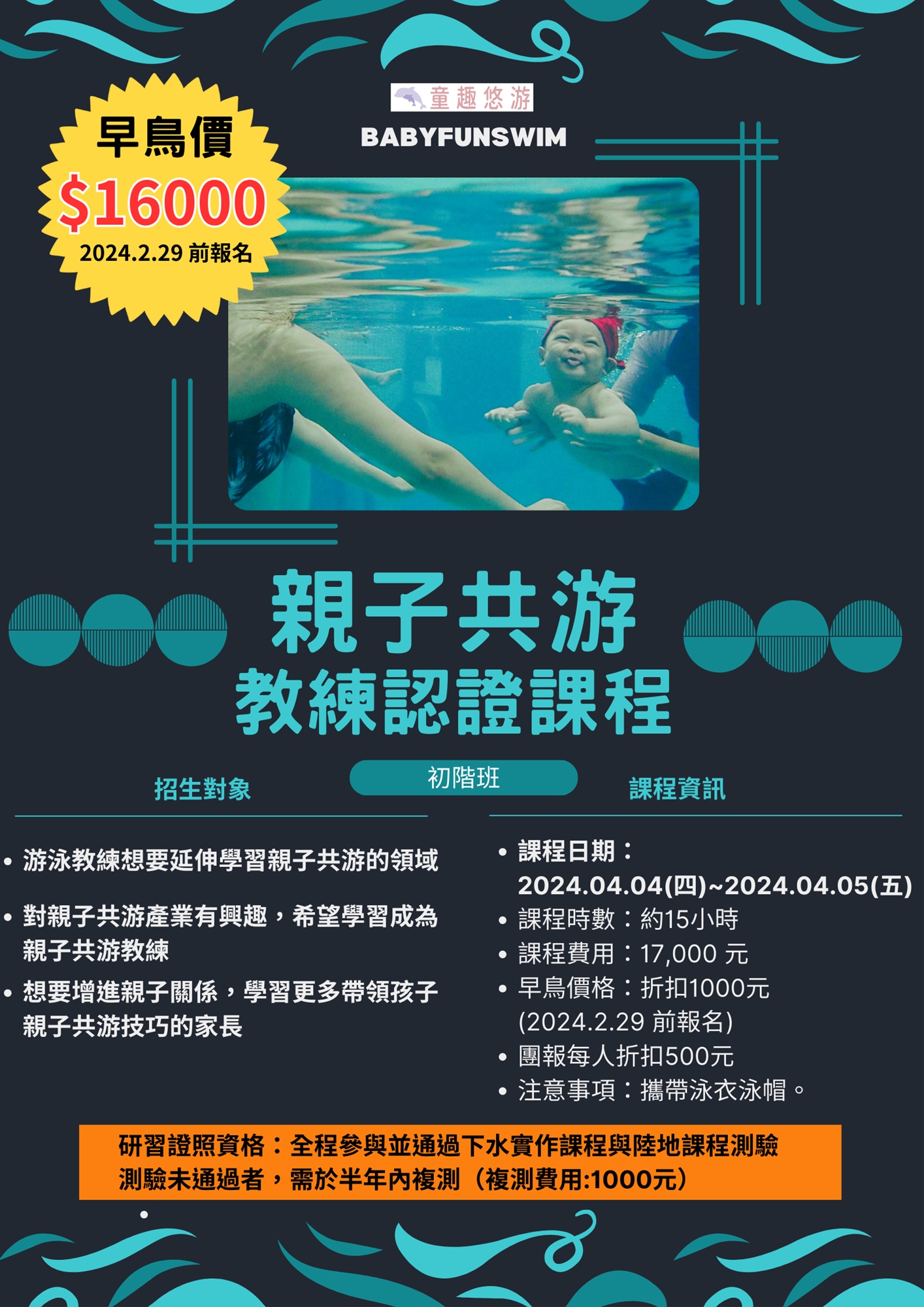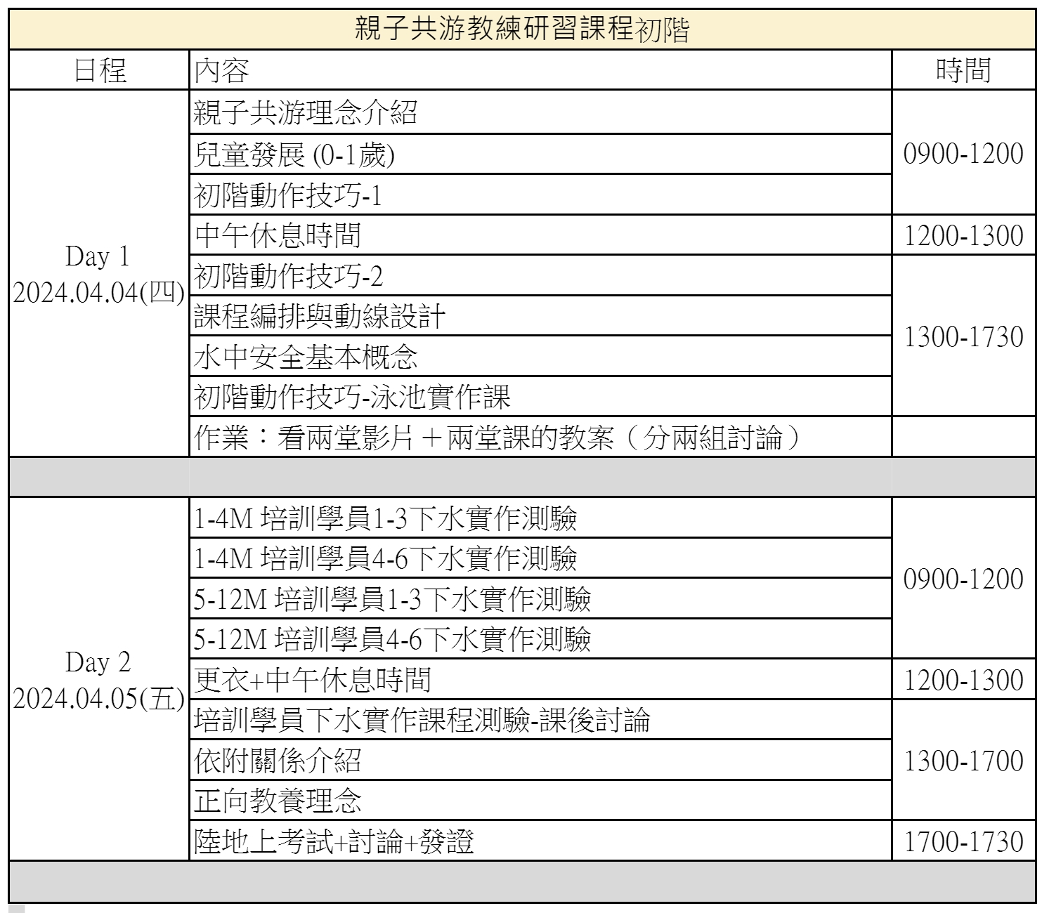 - 初階課程主旨在推廣親子共游活動並培養親子共游教練基礎帶課技巧。課程內容包含理念介紹、水中安全、課程編排與動線、動作技巧引導與下水實作測驗。課程簡章如下頁: