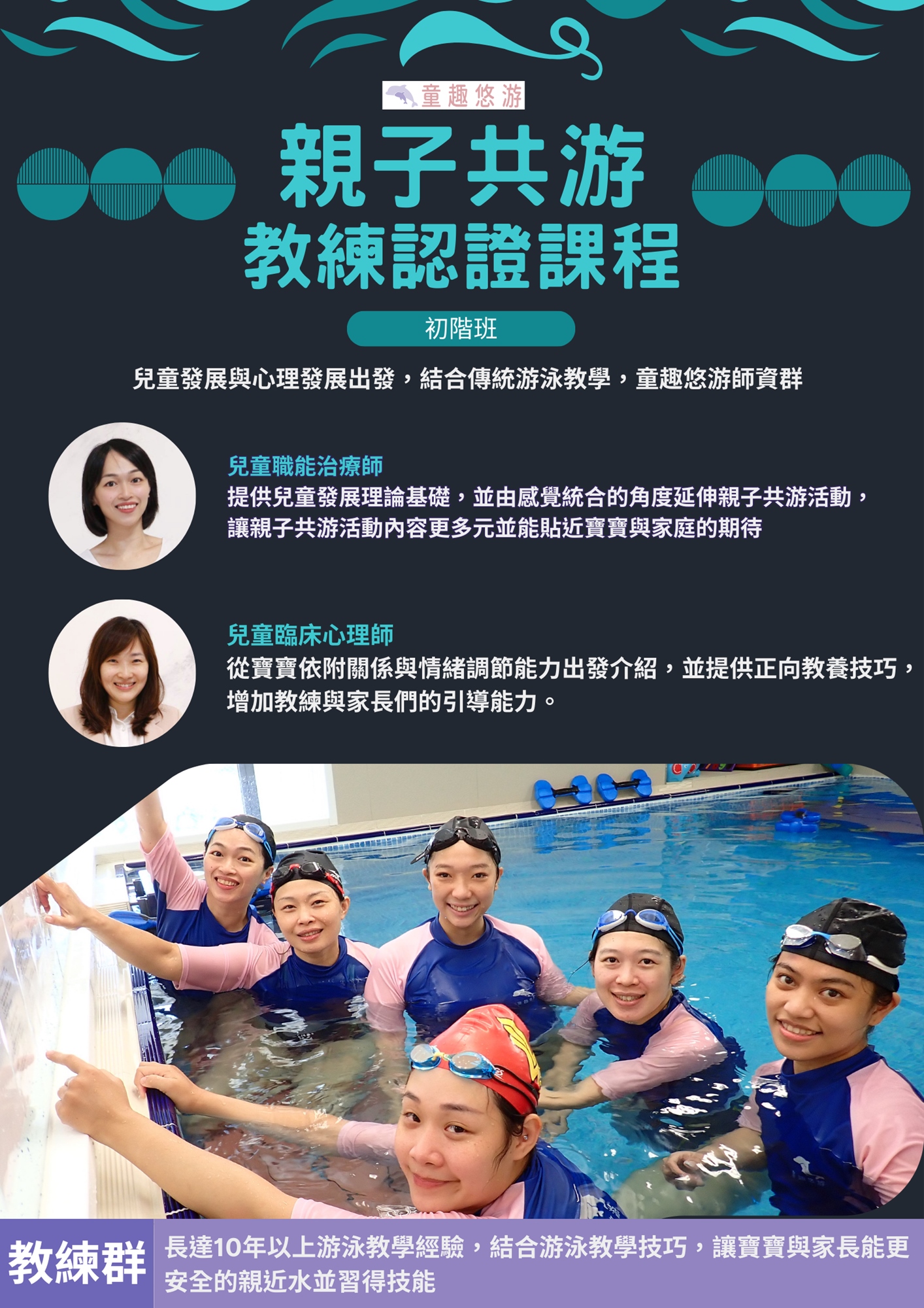從兒童發展與心理發展出發,結合傳統游泳教學,童趣悠游師資群包含: