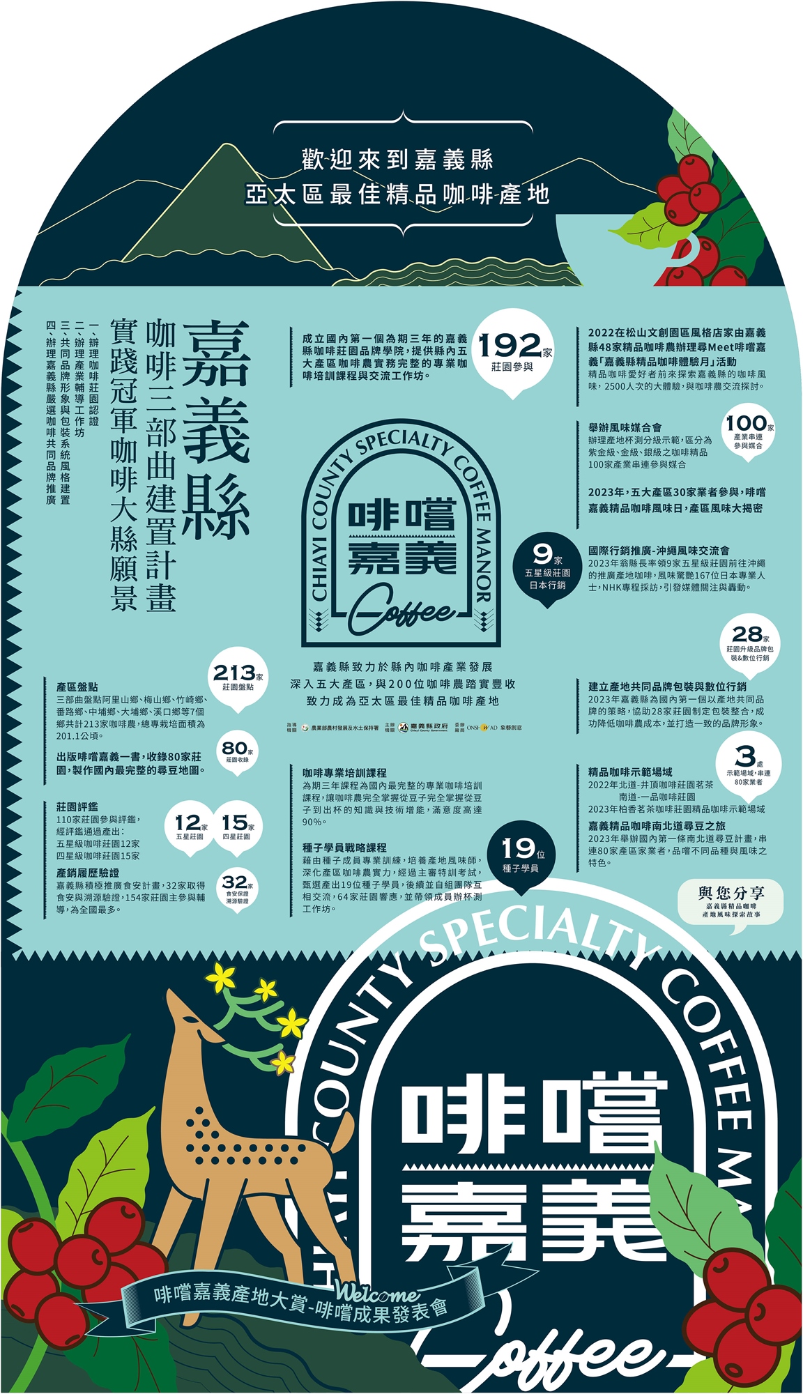 嘉義縣精品咖啡產地為台灣最佳的冠軍產地,嘉義縣五大產區中的咖啡農,無疑是亞太區精品咖啡產帶的佼佼者,在2023年咖啡界「奧斯卡」「台灣卓越盃咖啡示範競標」COE賽事,決選二十個名次中,嘉義縣一口氣拿了十八個名次,同時包辦前六名,表現亮眼出色。1月14日的午後,嘉義縣要跟大家分享,除了冠軍莊園的風味卓越外,嘉義縣的五大重要種植聚落的代表性咖啡莊園,包含阿里山鄉、梅山鄉、番路鄉、竹崎鄉、中埔鄉風味的星級多元風味,適合全家來尋豆品飲。