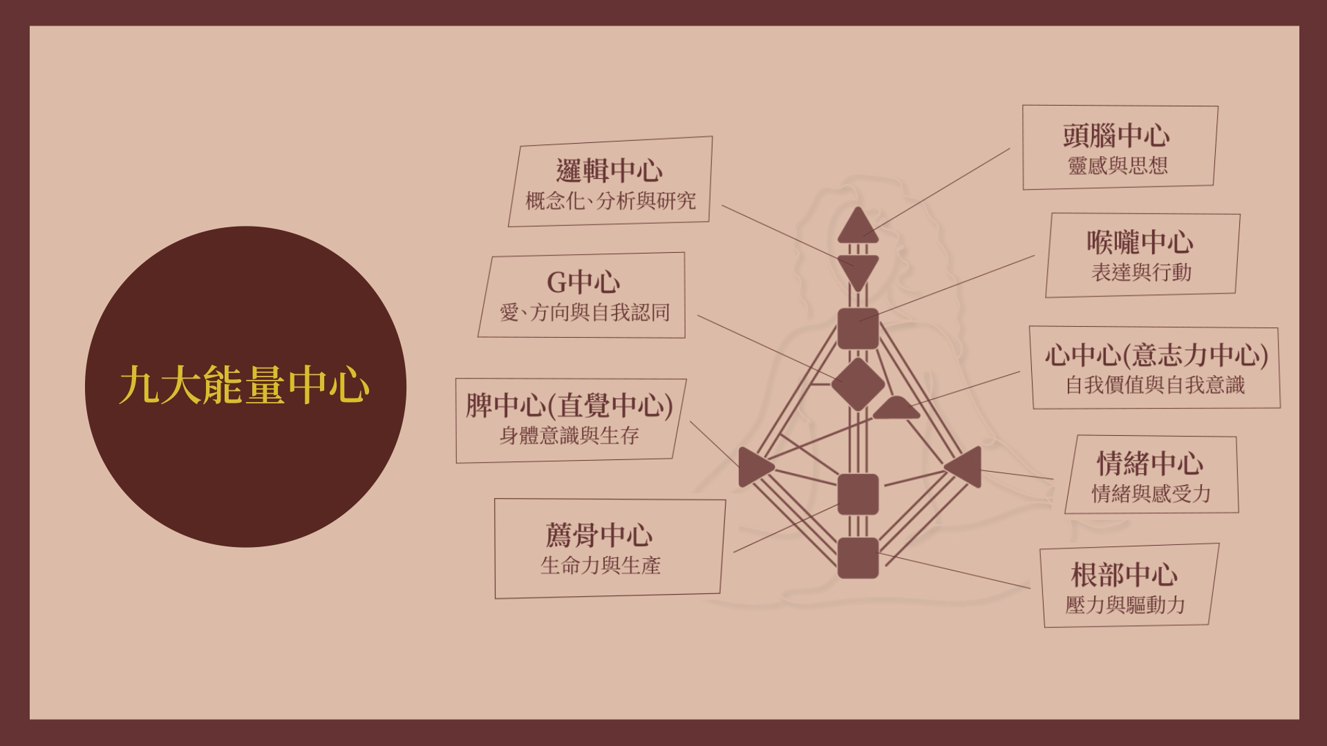 每個人都有獨特的運作,也有不穩定、容易受到外在影響的地方,而這一切的能量流動都從「九大能量中心」開始。