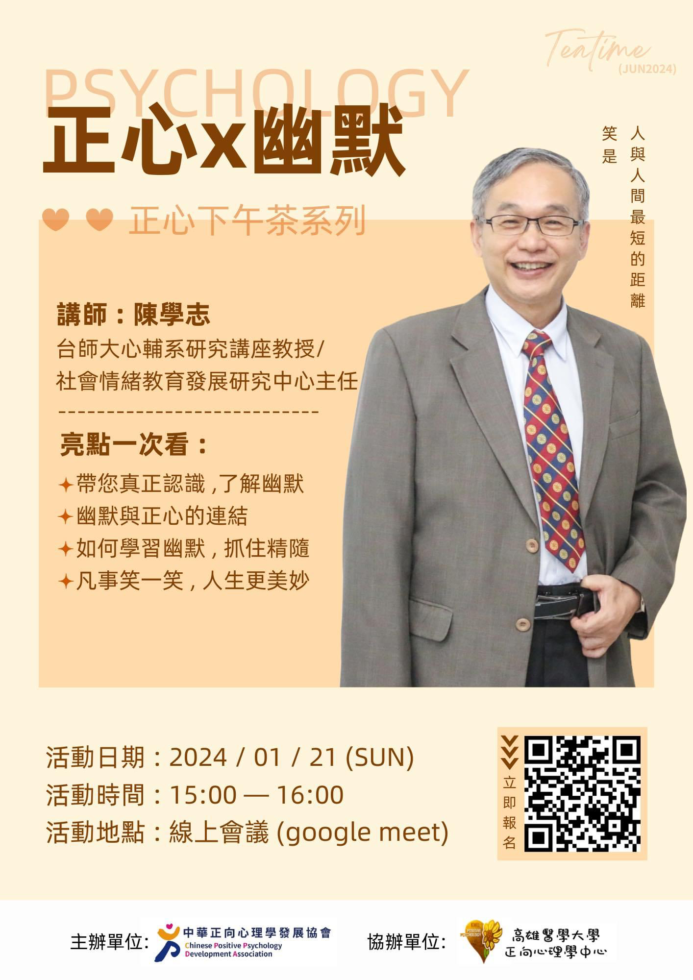 正心下午茶為中華正心協會為推廣正向心理學所做的活動~每個月固定推出一次,講座時長為一個小時,費用為完全免費!在2024年1月,我們邀請了台師大陳學志教授蒞臨講堂!邀請大家用一杯咖啡的時間,一起聆聽「幽默」能與正向心理學交織出什麼樣的火花!