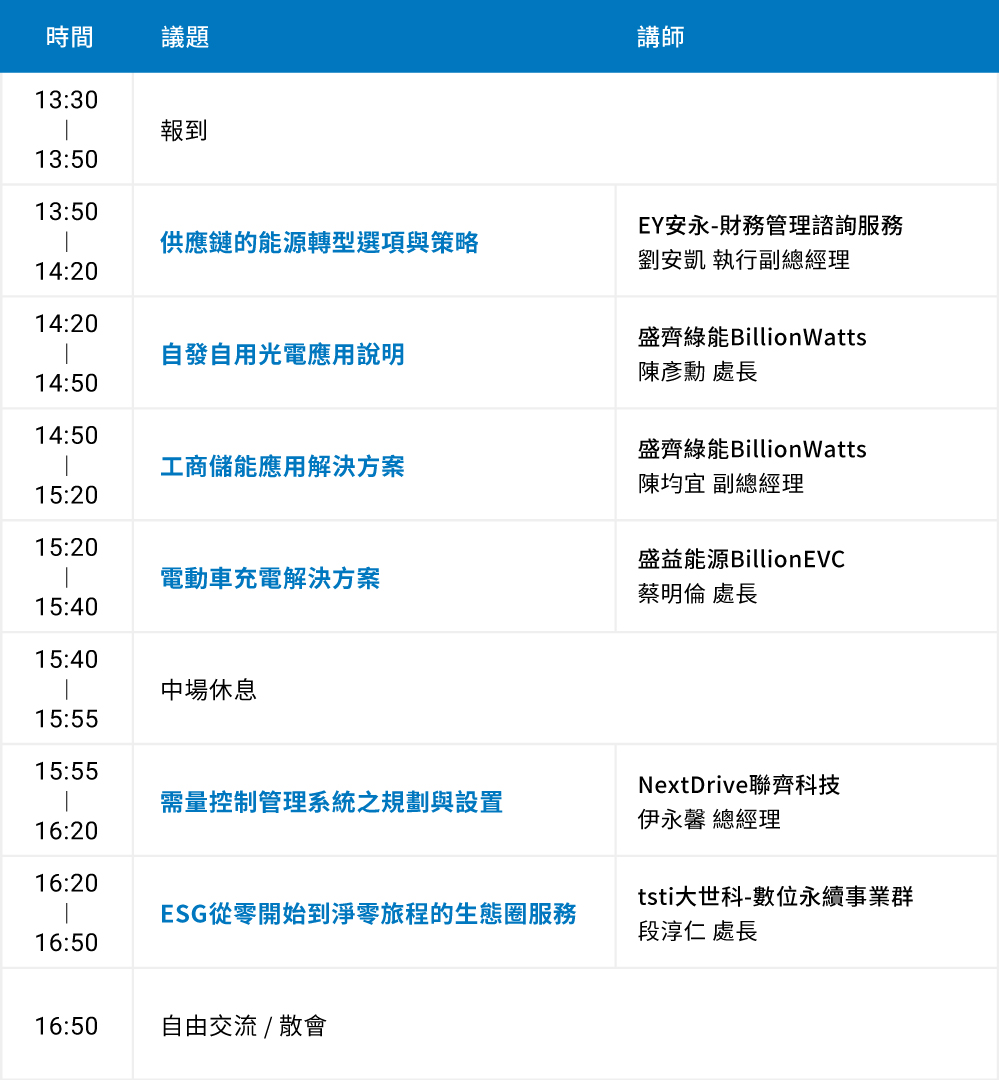盛齊本次研討會特別攜手綠能業界先進,精心設計多元化主題,其中涵蓋ESG碳盤查減碳策略與光電、儲能及充電樁應用解決方案,從用戶側的角度探討如何協助台灣製造業落實淨零轉型,內容非常適合電力業、工商企業、廠長及廠務人員等,有助企業啟動淨零之路,提升國際競爭優勢與永續發展目標。