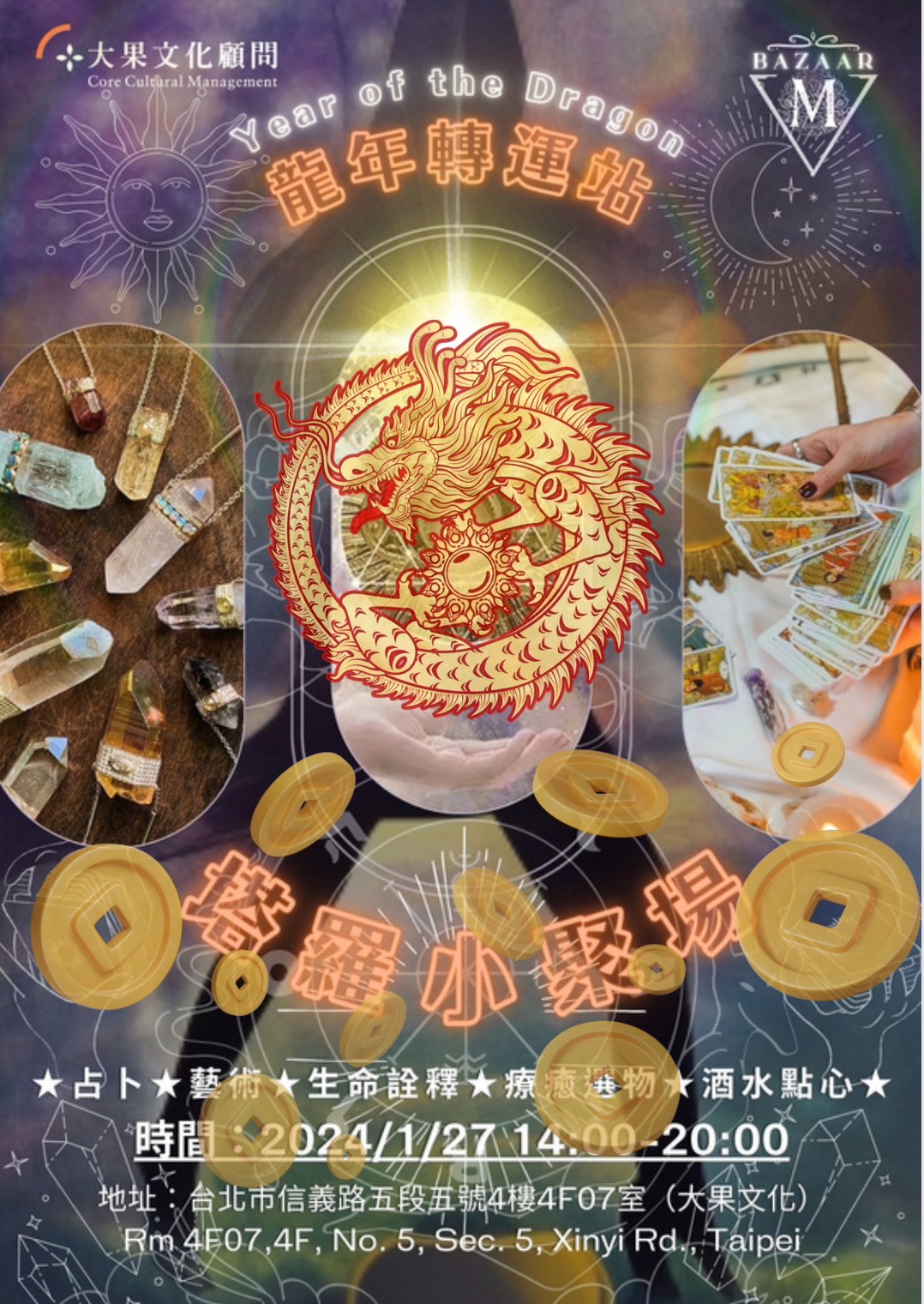 Embrace the auspicious vibes of the approaching Year of the Dragon and unlock the secrets that it holds for you. Join us for an extraordinary experience where divination, art, life interpretation, and healing converge into a delightful tapestry of fortune and well-being.