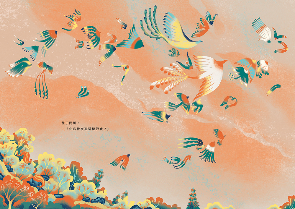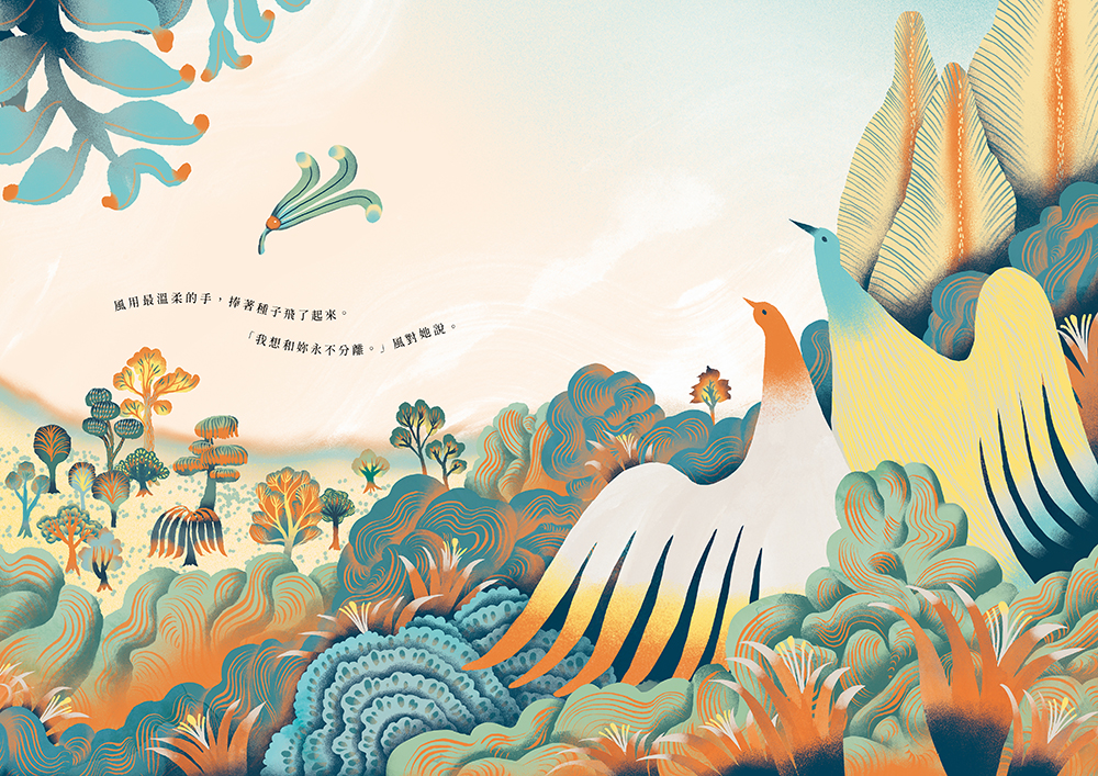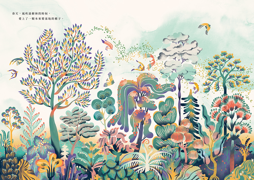 《種子和風》的繪者,是留法畫者王妤璇。王妤璇深愛植物,創作並一向以獨特的色彩概念著稱。她透過自己對自然的理解,再加上對色彩最奔騰的想像,把這個愛情故事畫出了有形與無形的繾綣。