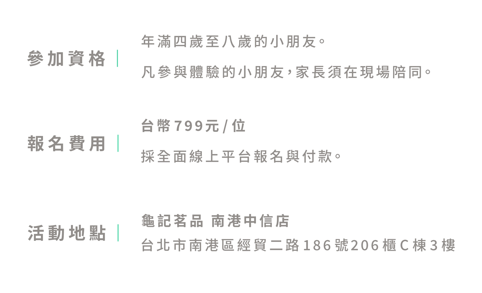 我們期待這個特別的日子裡,每位小小店長都能培養出對龜記品牌的獨特感受,同時拉近親子之間的感情連結。讓我們一起共創難忘、充滿愛的瞬間!