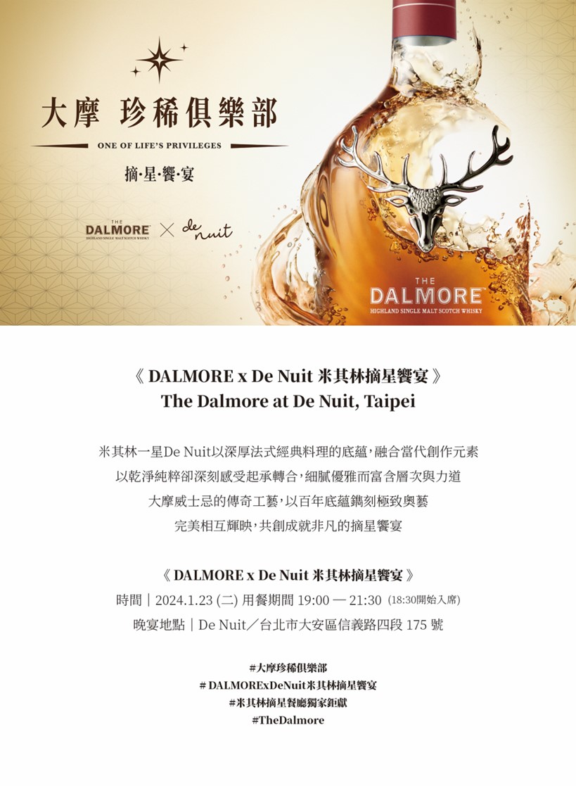 「大摩璀璨18年-2023 Edition -」老酒的完美體現,需要時間淬鍊與秉持著細節堅持,才能成就超越的珍稀,大摩璀璨18年單一麥芽蘇格蘭威士忌-2023 Edition -,歷經18年緩慢熟成,以美國波本桶、西班牙頂級酒莊González Byass獨家簽約的30年珍貴 Matusalem Oloroso雪莉桶熟成,使這款「大摩璀璨18年-2023 Edition -」充滿濃郁奶油太妃糖、水果葡萄乾風味,又在其中透露出大摩基因-微苦巧克力與英式柑橘果醬;而時間的淬煉不只呈現於超過18年的超凡熟成,同時也體現在完美的追求以及細節的堅持,選用大氣精美外盒盡顯雍容華貴,搭配銀色高貴大摩12支鹿角徽章,更是完美點出「大摩傳奇、璀燦不滅」的永垂不朽,除此之外,每瓶瓶身與盒上,都有當年度批次2023的限量訊息。建議售價 NT$12,000。
