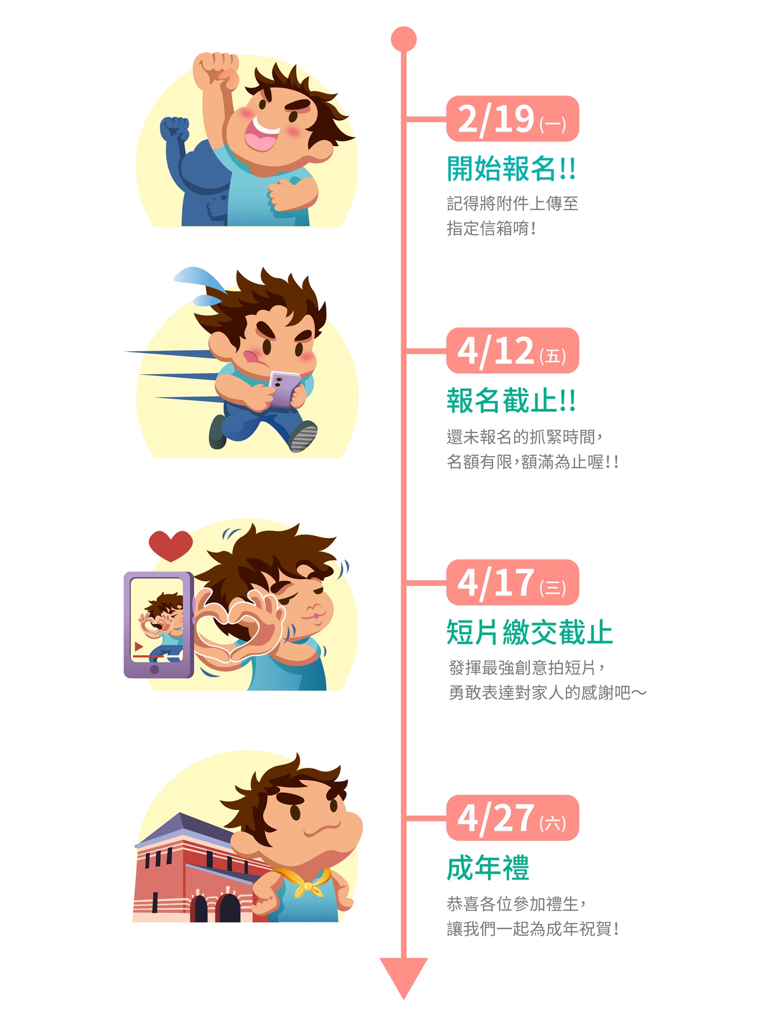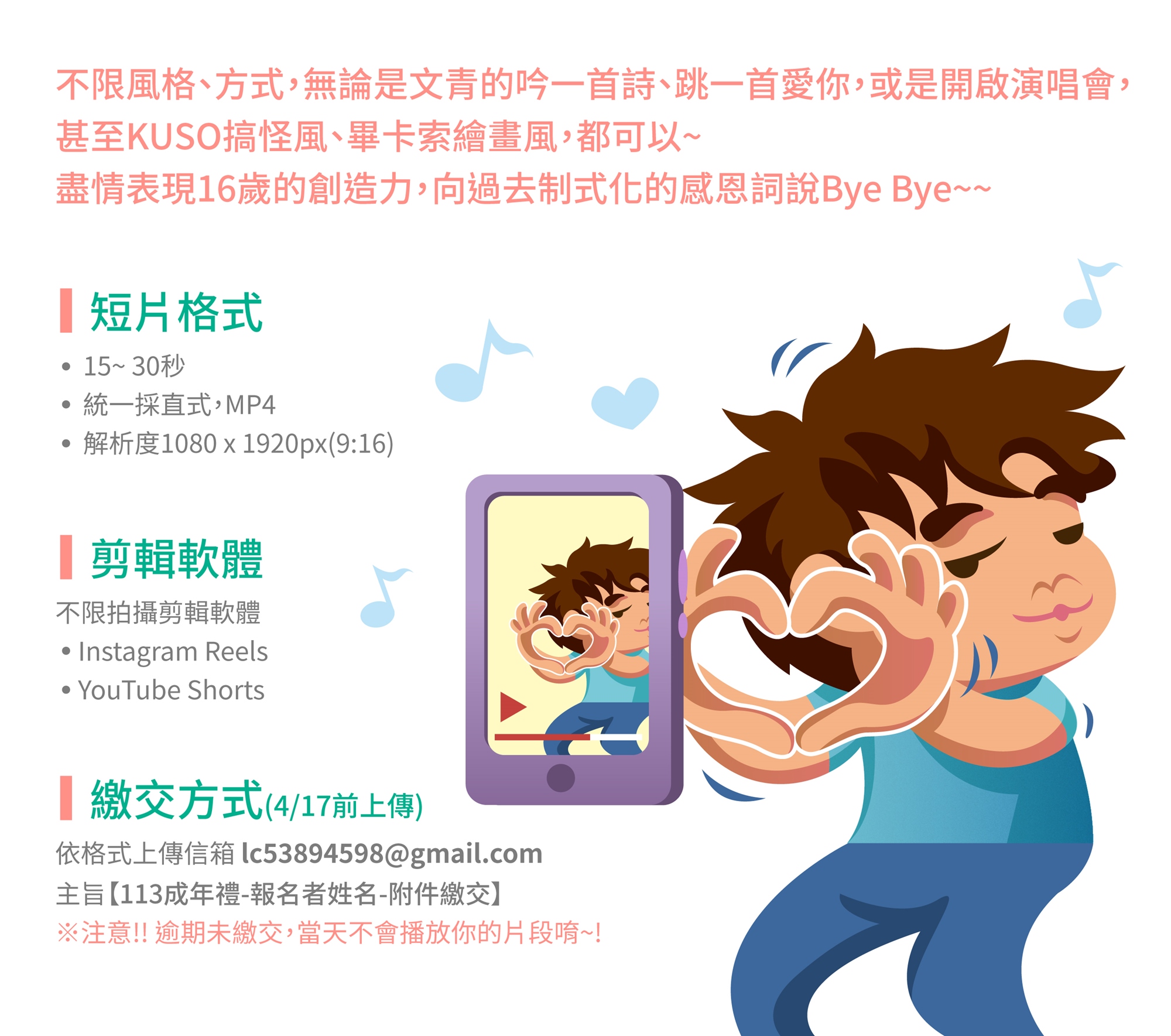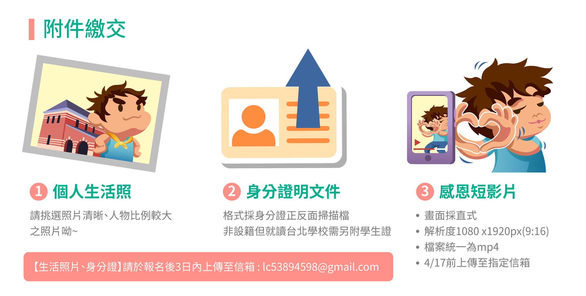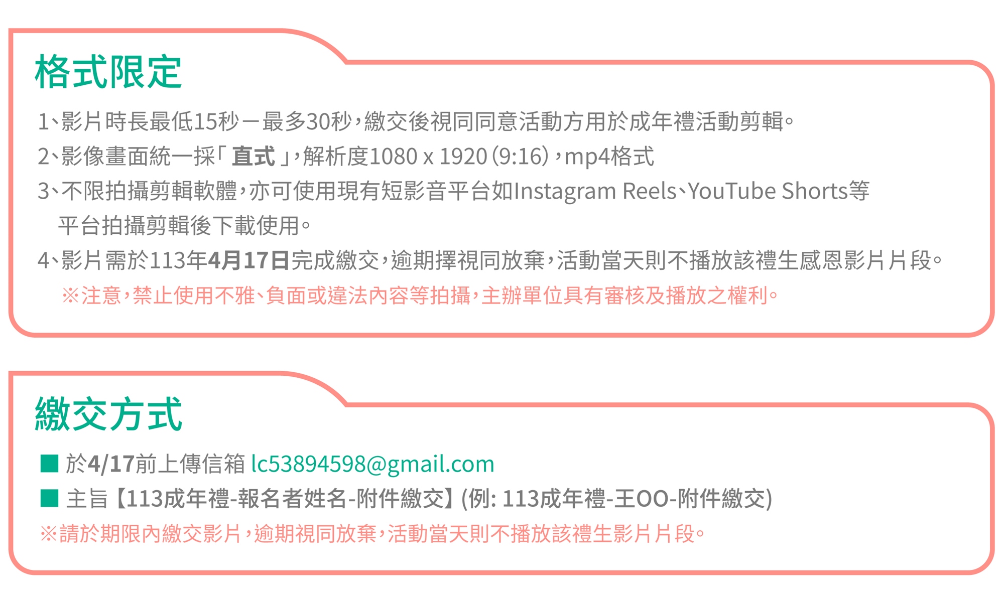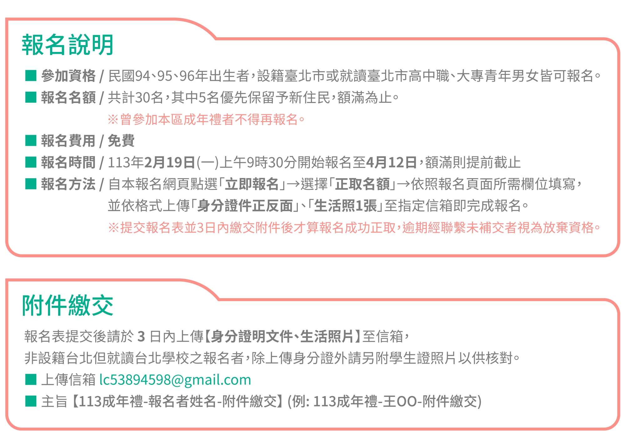 5、資料繳交指定信箱為「lc53894598@gmail.com」(英文為小寫LC),主旨【113成年禮-報名者姓名-附件繳交】(※例如:113年成年禮-王○○-附件繳交)